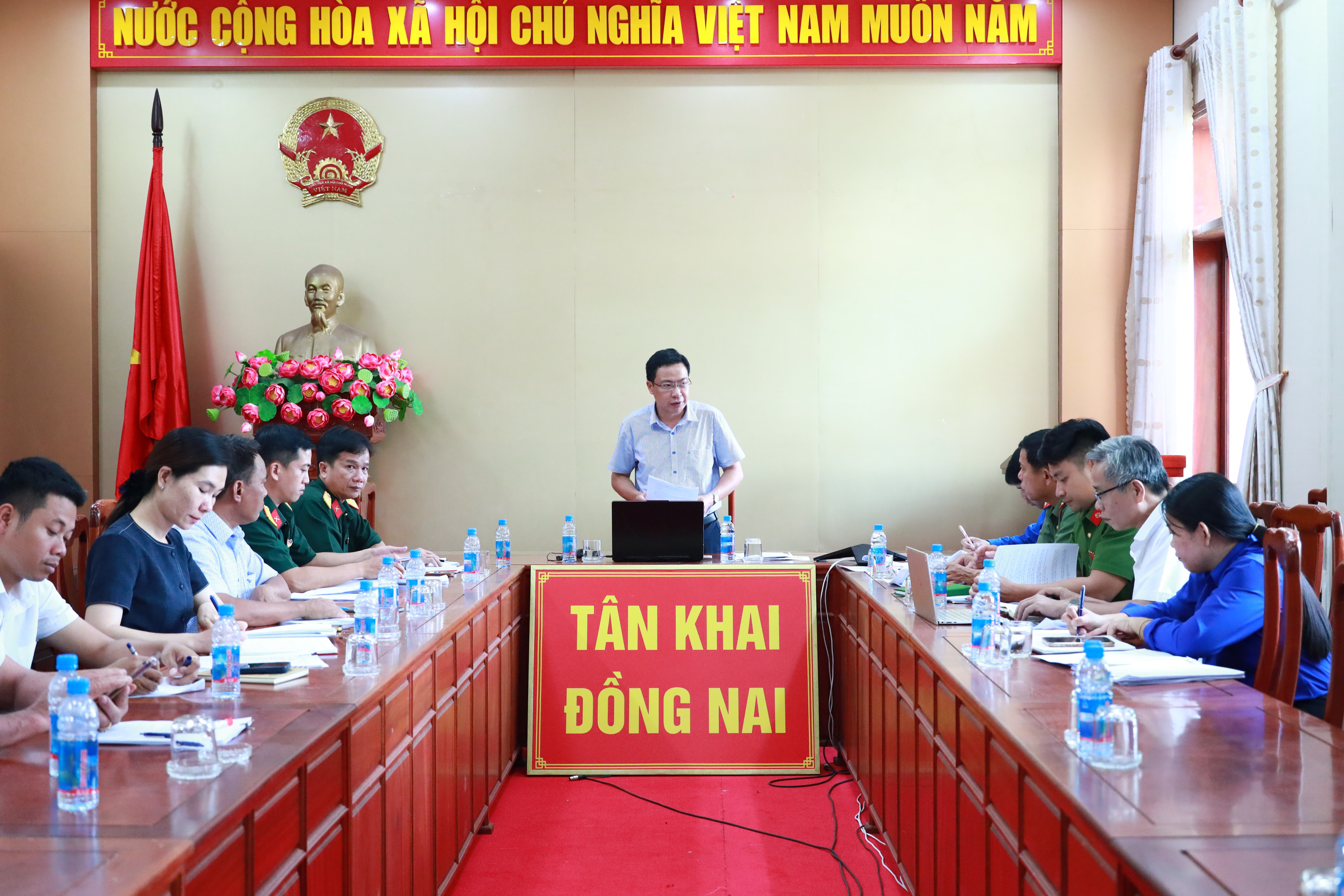 Đồng chí nhấn mạnh, Tân Khai dự kiến được chọn làm điểm tập kết giao, nhận quân của 16 xã, phường, với khoảng 800 công dân tham gia nghĩa vụ quân sự và nghĩa vụ Công an nhân dân. Vì vậy, công tác tổ chức phải được chuẩn bị chặt chẽ, chu đáo, an toàn và thiết thực, góp phần động viên thanh niên hăng hái lên đường làm nghĩa vụ thiêng liêng đối với Tổ quốc.