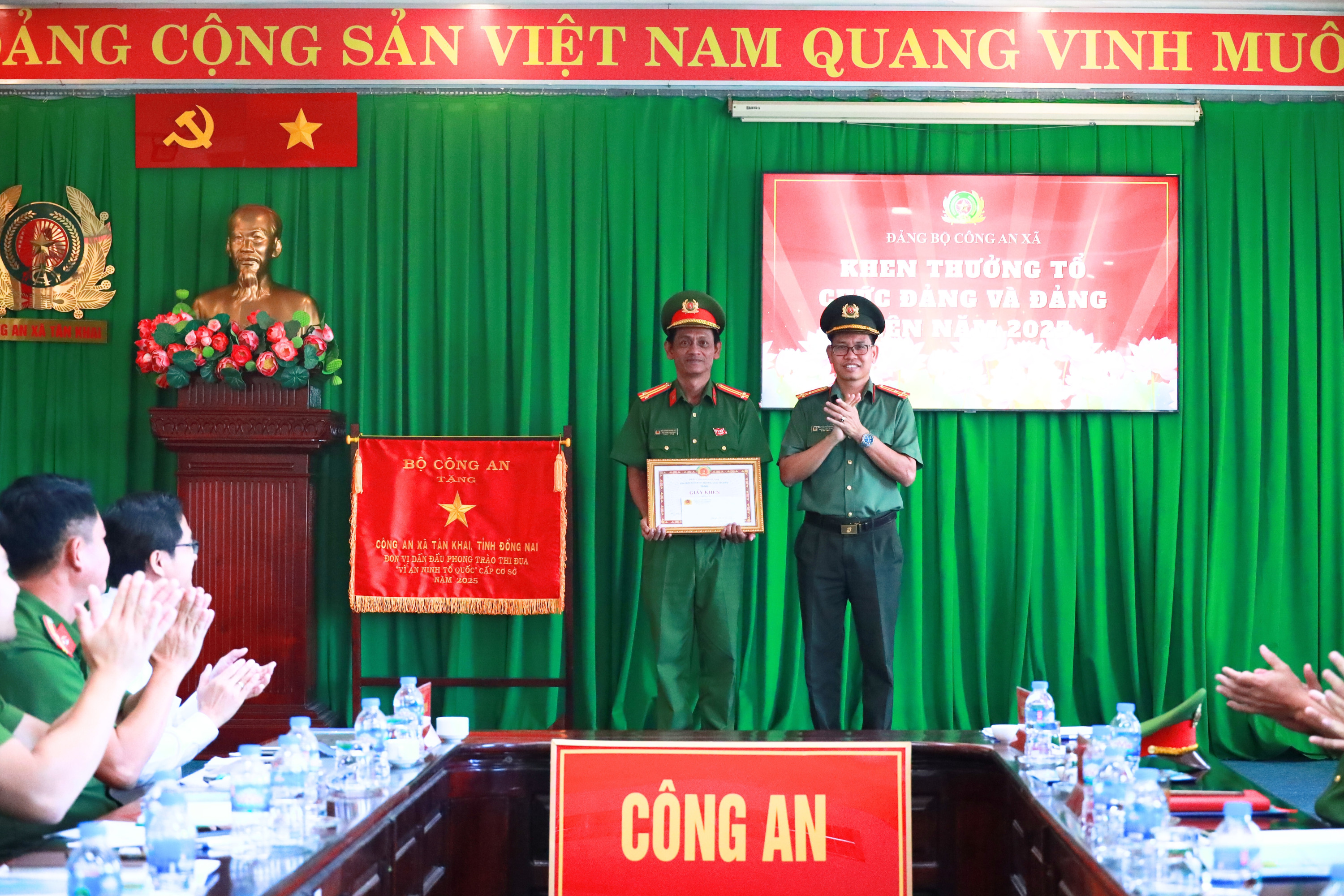 Theo đó, trong năm 2025, được sự quan tâm, lãnh đạo các cấp, các ngành; cùng sự phối hợp chặt chẽ của các phòng, ban, đoàn thể, các mặt công tác Đảng, công tác Công an xã Tân Khai đạt được kết quả đáng kể, góp phần xây dựng tổ chức Đảng trong sạch, vững mạnh, đảm bảo ANCT –TTATXH trên địa bàn. Nổi bật, trong năm 2025, tập thể Công an xã Tân Khai được xếp loại chất lượng mức “Hoàn thành xuất sắc nhiệm vụ”, dẫn đầu Cụm thi đua số 14 (gồm Công an 08 xã: Tân Khai, Minh Đức, Tân Hưng, Tân Quan, Nha Bích, Lộc Ninh, Lộc Hưng, Lộc Quang), được tuyên dương và trao tặng Cờ thi đua của Bộ Công an tại Hội nghị tổng kết công tác năm 2025, triển khai nhiệm vụ công tác năm 2026 của Công an tỉnh Đồng Nai. 08 đồng chí được đề nghị Giám đốc Công an tỉnh tặng thưởng danh hiệu “Chiến sỹ thi đua cơ sở”.