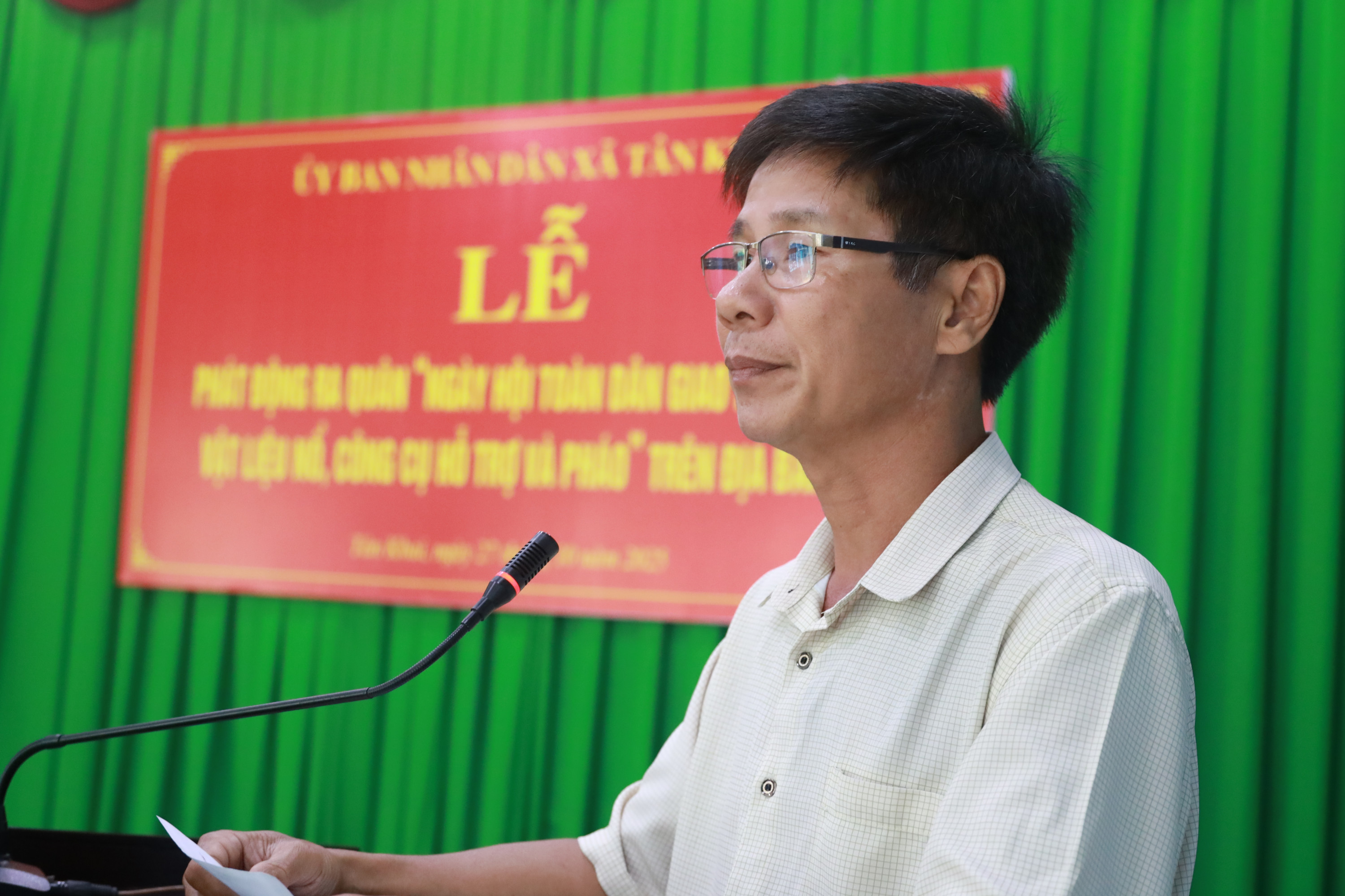 Phát biểu khai mạc và phát động tại buổi lễ, đồng chí Nguyễn Văn Cường, Phó Trưởng công an xã nhấn mạnh: việc tàng trữ, sử dụng trái phép vũ khí, vật liệu nổ, công cụ hỗ trợ và pháo là mối nguy lớn, không chỉ đe dọa an ninh trật tự mà còn ảnh hưởng đến sự phát triển bền vững và cuộc sống an toàn của nhân dân. Qua đó, kêu gọi toàn dân hãy tự giác giao nộp và kịp thời tố giác các hành vi mua bán, tàng trữ, sử dụng, chế tạo trái phép vũ khí, vật liệu nổ, công cụ hỗ trợ và pháo cho Công an theo quy định.