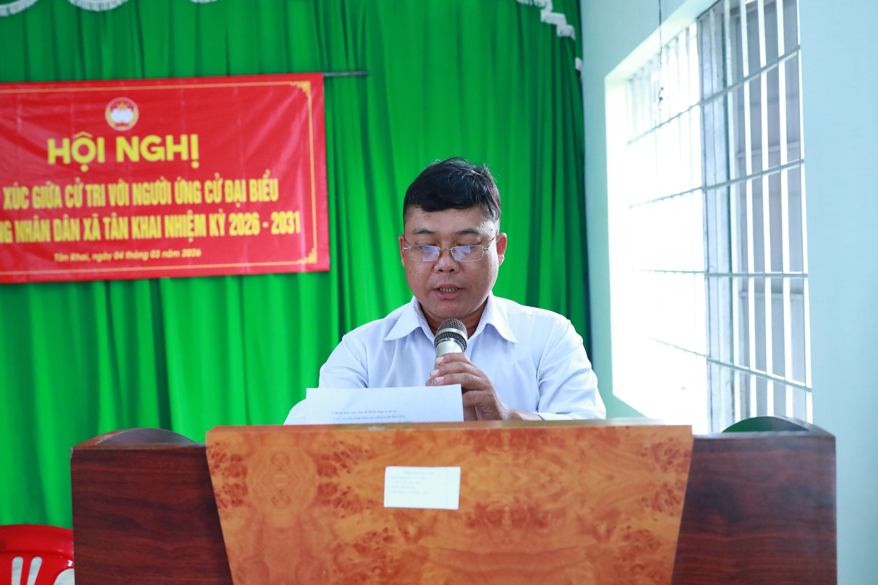 Chiều 04/03, tại Nhà văn hóa Sóc 5, xã Tân Khai, ông Nguyễn Văn Sáng – Ủy viên Ban Thường vụ, Chủ tịch Ủy ban Mặt trận Tổ quốc Việt Nam xã đã chủ trì Hội nghị tiếp xúc giữa cử tri với người ứng cử Đại biểu Hội đồng nhân dân xã Tân Khai nhiệm kỳ 2026–2031.
