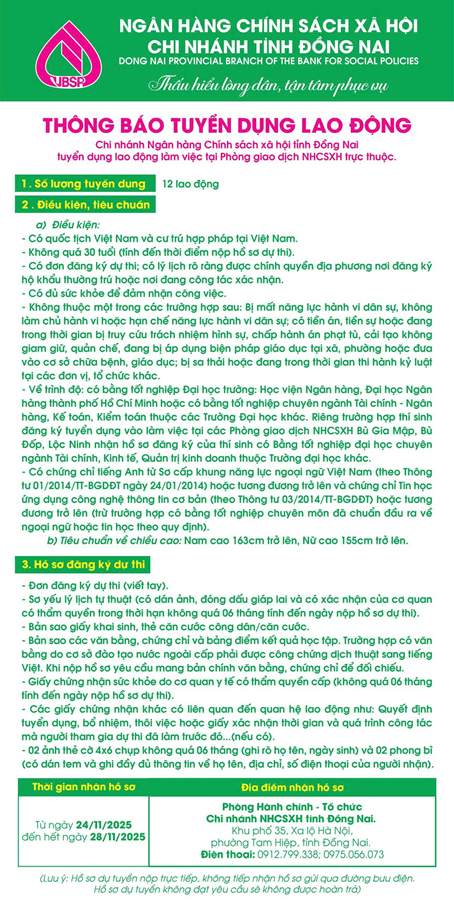 CHI NHÁNH NGÂN HÀNG CHÍNH SÁCH XÃ HỘI TỈNH ĐỒNG NAI TUYỂN DỤNG