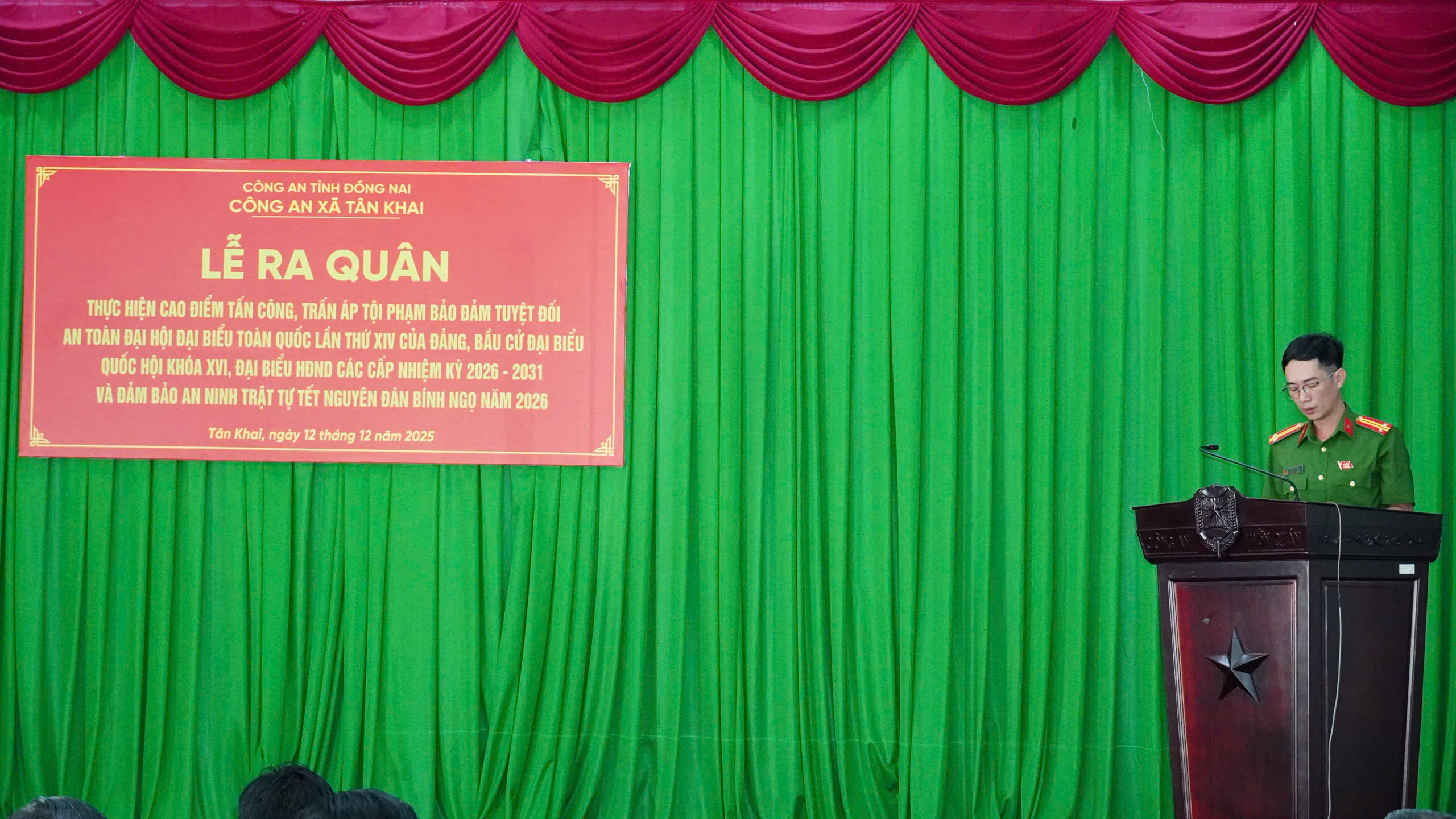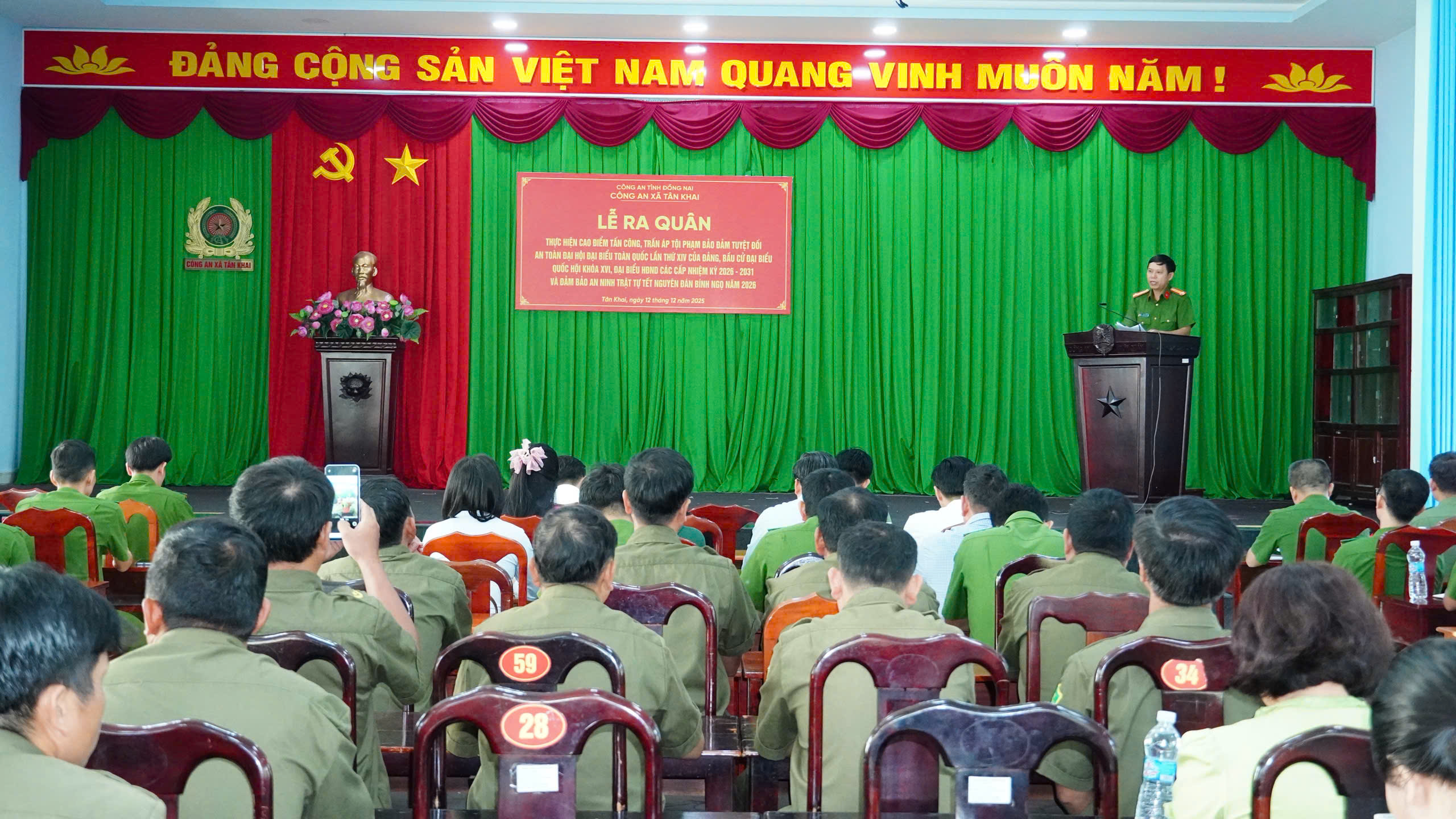 <span style="font-family:Arial,Helvetica,sans-serif;"><span style="font-size:14px;"><span style="line-height:normal">Sáng 12/12, Công an xã Tân Khai đã tổ chức lễ ra quân thực hiện đợt cao điểm tấn công, trấn áp tội phạm bảo đảm tuyệt đối an toàn Đại hội đại biểu toàn quốc lần thứ XIV của Đảng, bầu cử đại biểu Quốc hội khóa XVI, đại biểu HĐND các cấp nhiệm kỳ 2026 - 2031 và bảo đảm an ninh trật tự dịp Tết Nguyên đán Bính Ngọ năm 2026 trên địa bàn xã Tân Khai, nhằm huy động tối đa sự vào cuộc của toàn hệ thống chính trị và các lực lượng trên địa bàn xã cho đợt ra quân.</span><br />