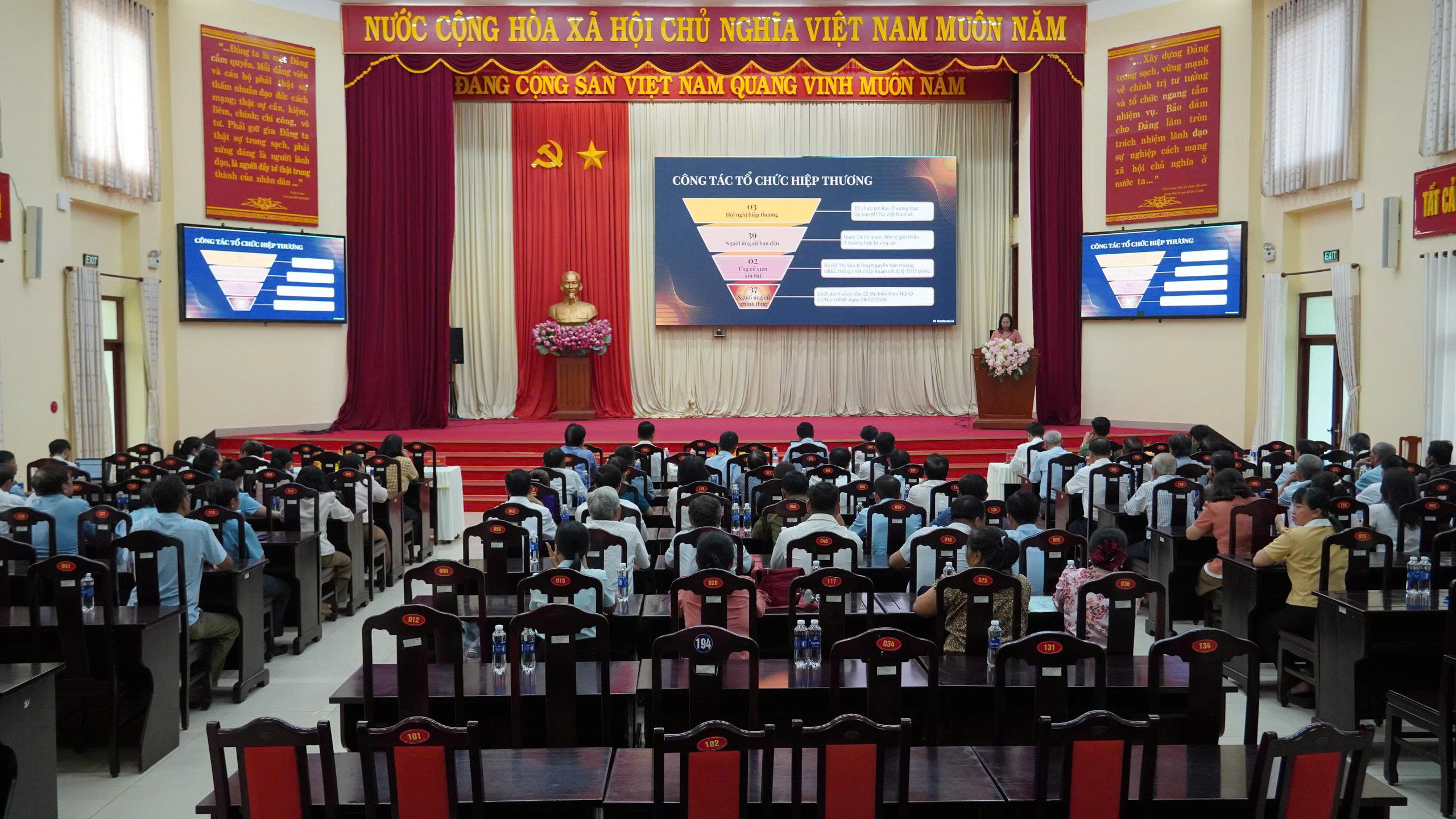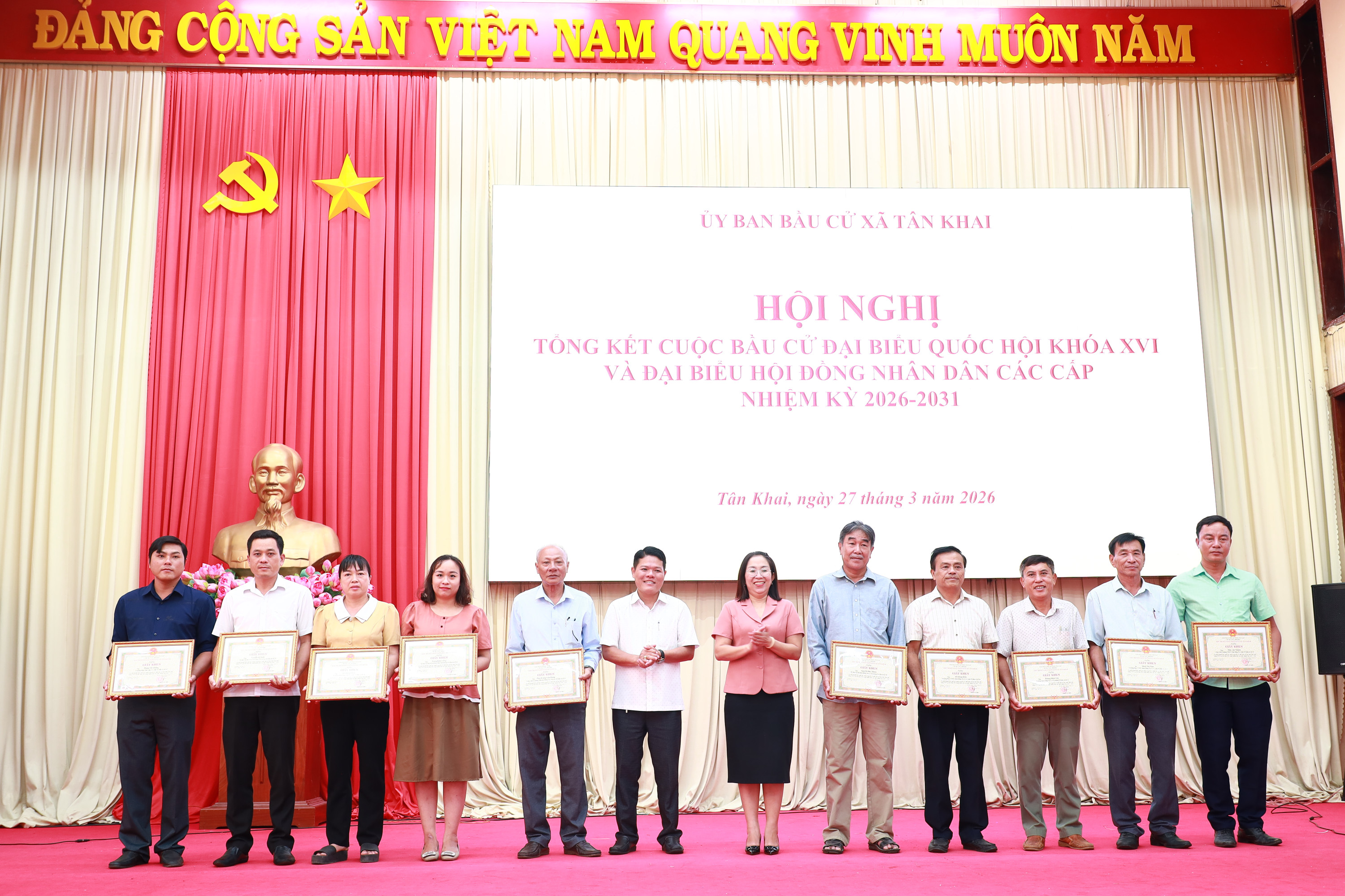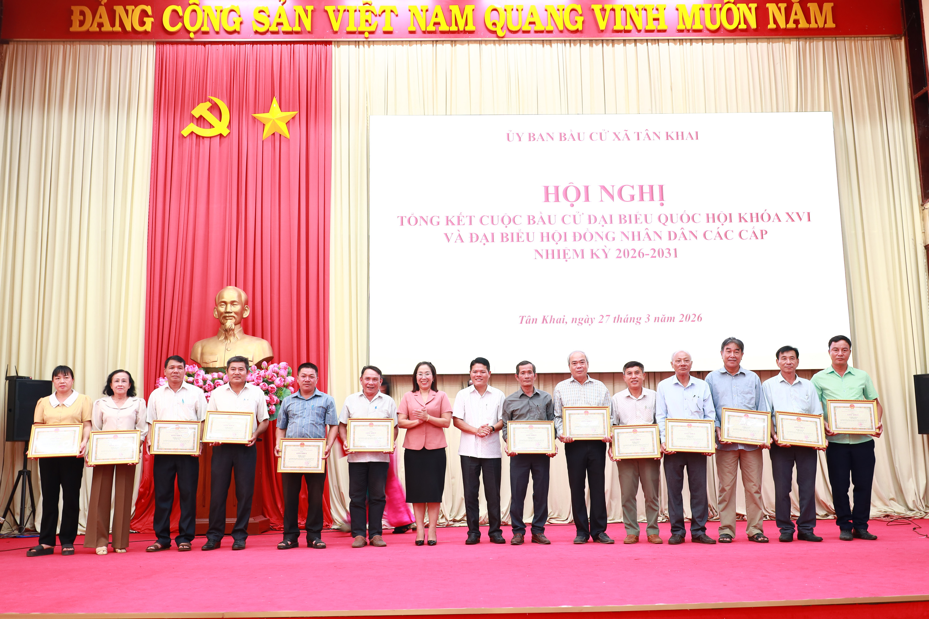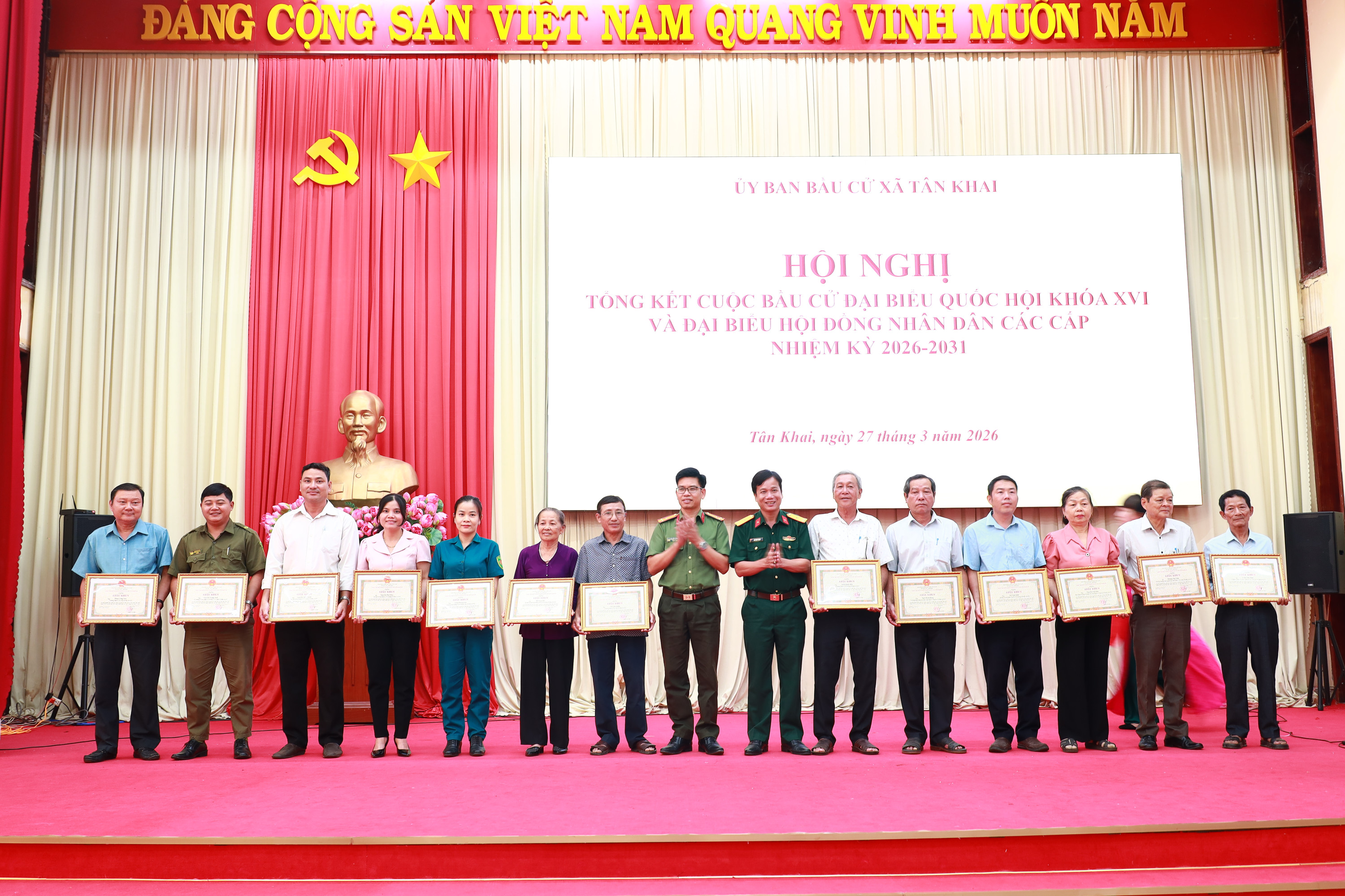 <div style="text-align: justify;"><span style="font-family:Arial,Helvetica,sans-serif;"><span style="font-size:14px;">Chiều 27/3, Ủy ban Bầu cử xã Tân Khai đã tổ chức Hội nghị tổng kết công tác bầu cử đại biểu Quốc hội khóa XVI và đại biểu Hội đồng nhân dân các cấp, nhiệm kỳ 2026 – 2031. Tham dự hội nghị có các đồng chí Thường trực Đảng ủy; các đồng chí Phó Chủ tịch Hội đồng nhân dân, Ủy ban nhân dân xã; cùng các thành viên Ban Chỉ đạo bầu cử, Ủy ban Bầu cử xã, 07 Ban bầu cử, 21 tổ bầu cử, Bí thư chi bộ, trưởng các thôn, sóc.<br />