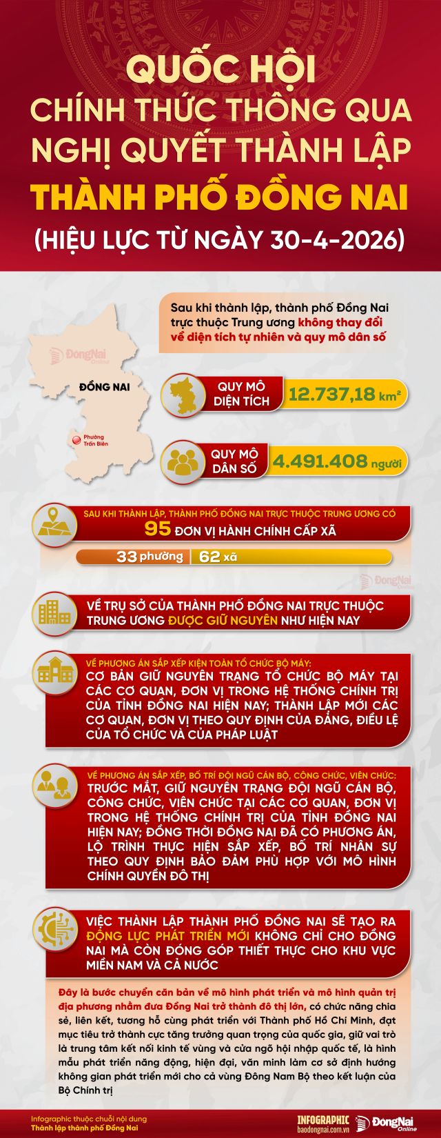 <p>QUỐC HỘI CHÍNH THỨC THÔNG QUA NGHỊ QUYẾT VỀ THÀNH LẬP THÀNH PHỐ ĐỒNG NAI (HIỆU LỰC TỪ 30/04/2026)</p><div class="xdj266r x14z9mp xat24cr x1lziwak x1vvkbs" style="-webkit-text-stroke-width:0px;background-color:rgb(240, 242, 245);color:rgb(8, 8, 9);font-family:&#039;Segoe UI Historic&#039;, &#039;Segoe UI&#039;, Helvetica, Arial, sans-serif;font-size:15px;font-style:normal;font-variant-caps:normal;font-variant-ligatures:normal;font-weight:400;letter-spacing:normal;margin-bottom:0px;margin-inline:0px;margin-top:0px;orphans:2;overflow-wrap:break-word;text-align:start;text-decoration-color:initial;text-decoration-style:initial;text-decoration-thickness:initial;text-indent:0px;text-transform:none;white-space:normal;widows:2;word-spacing:0px;"><div style="font-family:inherit;text-align:start;" dir="auto">Sáng 24/4, với 478/487 đại biểu tham gia biểu quyết tán thành (bằng 95,60% tổng số đại biểu Quốc hội), Quốc hội đã thông qua Nghị quyết của Quốc hội về việc thành lập thành phố Đồng Nai.</div></div><div class="x14z9mp xat24cr x1lziwak x1vvkbs xtlvy1s" style="-webkit-text-stroke-width:0px;background-color:rgb(240, 242, 245);color:rgb(8, 8, 9);font-family:&#039;Segoe UI Historic&#039;, &#039;Segoe UI&#039;, Helvetica, Arial, sans-serif;font-size:15px;font-style:normal;font-variant-caps:normal;font-variant-ligatures:normal;font-weight:400;letter-spacing:normal;margin-bottom:0px;margin-inline:0px;margin-top:0.5em;orphans:2;overflow-wrap:break-word;text-align:start;text-decoration-color:initial;text-decoration-style:initial;text-decoration-thickness:initial;text-indent:0px;text-transform:none;white-space:normal;widows:2;word-spacing:0px;"><div style="font-family:inherit;text-align:start;" dir="auto">Quốc hội quyết nghị thành lập thành phố Đồng Nai trên cơ sở toàn bộ diện tích tự nhiên và quy mô dân số của tỉnh Đồng Nai. Thành phố Đồng Nai giáp Thành phố Hồ Chí Minh, tỉnh Lâm Đồng, tỉnh Tây Ninh và Vương quốc Campuchia.</div></div><div class="x14z9mp xat24cr x1lziwak x1vvkbs xtlvy1s" style="-webkit-text-stroke-width:0px;background-color:rgb(240, 242, 245);color:rgb(8, 8, 9);font-family:&#039;Segoe UI Historic&#039;, &#039;Segoe UI&#039;, Helvetica, Arial, sans-serif;font-size:15px;font-style:normal;font-variant-caps:normal;font-variant-ligatures:normal;font-weight:400;letter-spacing:normal;margin-bottom:0px;margin-inline:0px;margin-top:0.5em;orphans:2;overflow-wrap:break-word;text-align:start;text-decoration-color:initial;text-decoration-style:initial;text-decoration-thickness:initial;text-indent:0px;text-transform:none;white-space:normal;widows:2;word-spacing:0px;"><div style="font-family:inherit;text-align:start;" dir="auto">Nghị quyết nêu rõ, Chính phủ, Hội đồng nhân dân, Ủy ban nhân dân tỉnh Đồng Nai (Hội đồng nhân dân, Ủy ban nhân dân thành phố Đồng Nai kể từ ngày Nghị quyết này có hiệu lực thi hành) và các cơ quan, tổ chức hữu quan có trách nhiệm tổ chức thi hành Nghị quyết này; sắp xếp, kiện toàn tổ chức bộ máy các cơ quan, tổ chức ở địa phương theo quy định; ổn định đời sống của nhân dân địa phương, bảo đảm yêu cầu phát triển kinh tế-xã hội, quốc phòng và an ninh trên địa bàn.</div></div><div class="x14z9mp xat24cr x1lziwak x1vvkbs xtlvy1s" style="-webkit-text-stroke-width:0px;background-color:rgb(240, 242, 245);color:rgb(8, 8, 9);font-family:&#039;Segoe UI Historic&#039;, &#039;Segoe UI&#039;, Helvetica, Arial, sans-serif;font-size:15px;font-style:normal;font-variant-caps:normal;font-variant-ligatures:normal;font-weight:400;letter-spacing:normal;margin-bottom:0px;margin-inline:0px;margin-top:0.5em;orphans:2;overflow-wrap:break-word;text-align:start;text-decoration-color:initial;text-decoration-style:initial;text-decoration-thickness:initial;text-indent:0px;text-transform:none;white-space:normal;widows:2;word-spacing:0px;"><div style="font-family:inherit;text-align:start;" dir="auto">Các cơ quan, tổ chức, đơn vị có tên gọi gắn với địa danh tỉnh Đồng Nai được đổi tên để hoạt động với tên gọi thành phố Đồng Nai kể từ ngày Nghị quyết có hiệu lực thi hành.</div></div><div class="x14z9mp xat24cr x1lziwak x1vvkbs xtlvy1s" style="-webkit-text-stroke-width:0px;background-color:rgb(240, 242, 245);color:rgb(8, 8, 9);font-family:&#039;Segoe UI Historic&#039;, &#039;Segoe UI&#039;, Helvetica, Arial, sans-serif;font-size:15px;font-style:normal;font-variant-caps:normal;font-variant-ligatures:normal;font-weight:400;letter-spacing:normal;margin-bottom:0px;margin-inline:0px;margin-top:0.5em;orphans:2;overflow-wrap:break-word;text-align:start;text-decoration-color:initial;text-decoration-style:initial;text-decoration-thickness:initial;text-indent:0px;text-transform:none;white-space:normal;widows:2;word-spacing:0px;"><div style="font-family:inherit;text-align:start;" dir="auto">Văn bản, giấy tờ đã được cơ quan, chức danh có thẩm quyền ban hành, cấp trước khi Nghị quyết này có hiệu lực thi hành mà chưa hết hiệu lực hoặc chưa hết thời hạn sử dụng thì tiếp tục được áp dụng, sử dụng theo quy định của pháp luật cho đến khi hết thời hạn hoặc được sửa đổi, bổ sung, thay thế, bãi bỏ, hủy bỏ, thu hồi bởi cơ quan, người có thẩm quyền.</div></div><div class="x14z9mp xat24cr x1lziwak x1vvkbs xtlvy1s" style="-webkit-text-stroke-width:0px;background-color:rgb(240, 242, 245);color:rgb(8, 8, 9);font-family:&#039;Segoe UI Historic&#039;, &#039;Segoe UI&#039;, Helvetica, Arial, sans-serif;font-size:15px;font-style:normal;font-variant-caps:normal;font-variant-ligatures:normal;font-weight:400;letter-spacing:normal;margin-bottom:0p