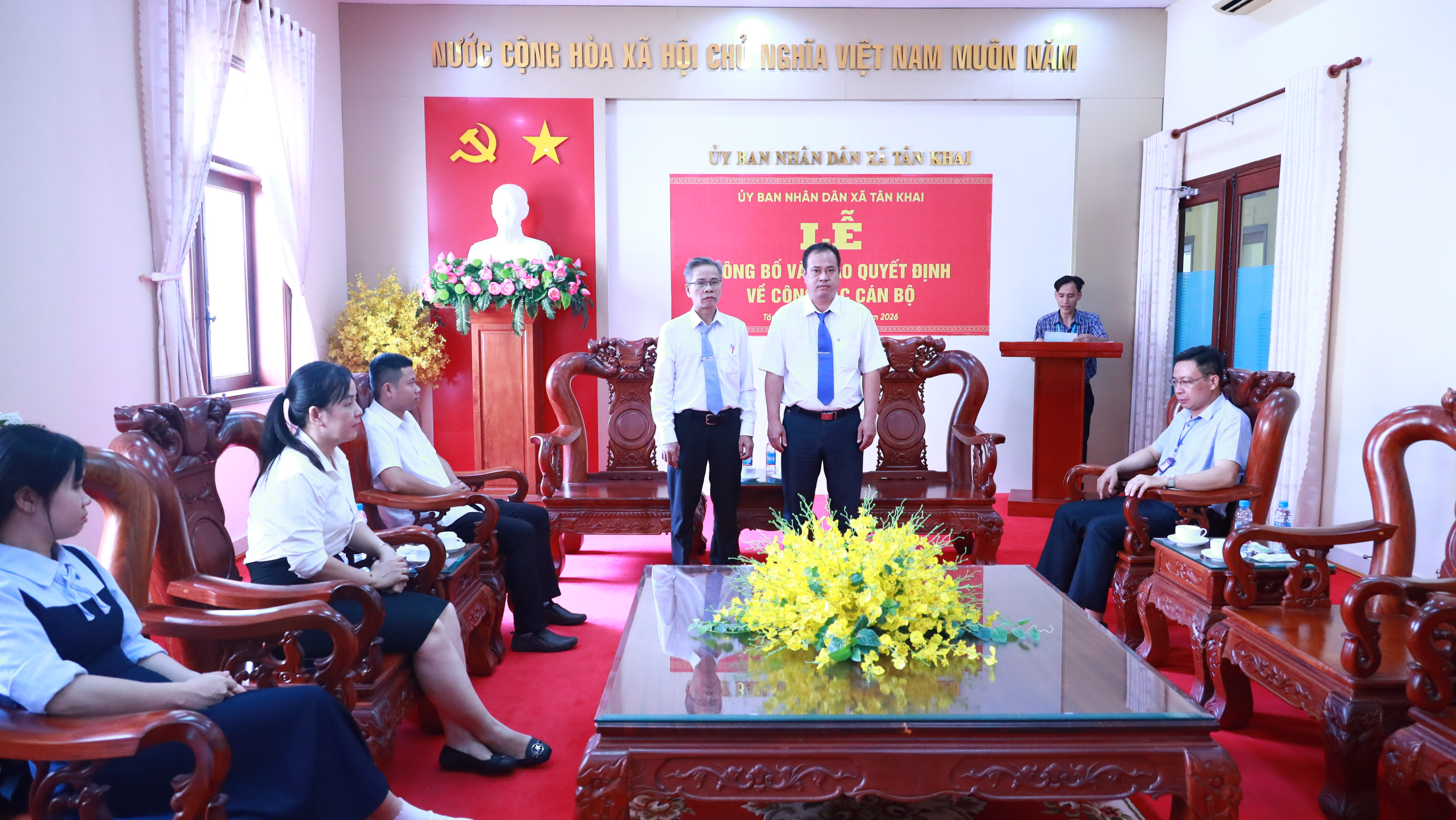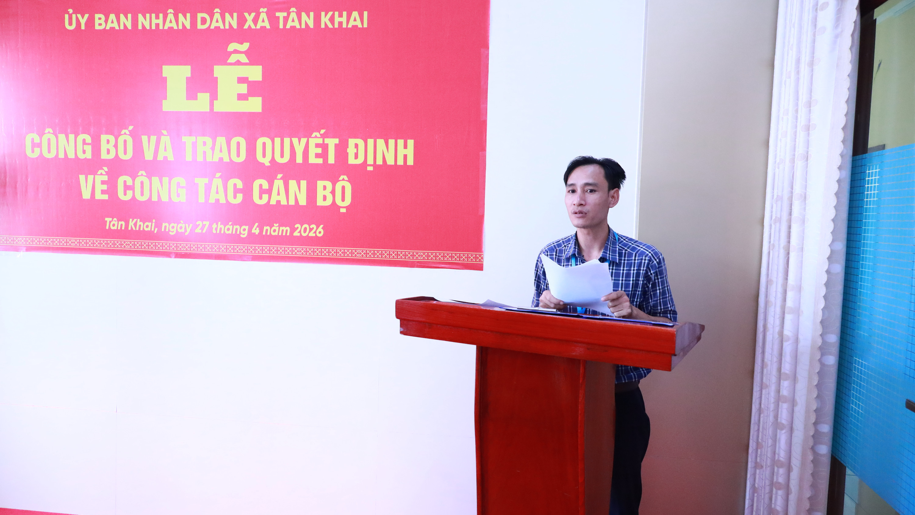 <p style="text-align:center;">&nbsp;</p><p style="text-align:justify;text-indent:36.0pt;"><span style="font-size:14.0pt;"><span style="line-height:107%;">Sáng ngày 27/04/2025, UBND xã Tân Khai tổ chức Lễ công bố và trao các quyết định về công tác cán bộ.</span></span></p><p style="text-align:justify;text-indent:36.0pt;"><span style="font-size:14.0pt;"><span style="line-height:107%;">Dự buổi lễ, trao quyết định và tặng hoa chúc mừng có ông Nguyễn Viết Đợi – Phó Chủ tịch UBND xã Tân Khai. Cùng tham dự có lãnh đạo Phòng Văn hóa – Xã hội và các cá nhân nhận quyết định.</span></span></p><p style="text-align:justify;"><span style="font-size:14.0pt;"><span style="line-height:107%;">Tại buổi lễ, ông Đặng Bá Báu – Trưởng Phòng Văn hóa – Xã hội đã công bố các quyết định, gồm: giao phụ trách Trung tâm Phục vụ hành chính công đối với ông Dương Kim Đương – Phó Giám đốc Trung tâm Phục vụ hành chính công, phụ trách điều hành hoạt động của Trung tâm cho đến khi có chức danh Giám đốc; bổ nhiệm Phó Giám đốc và giao phụ trách Trạm Y tế xã Tân Khai đối với ông Phan Văn Tập, viên chức Trạm Y tế xã,, đồng thời phụ trách Trạm Y tế xã cho đến khi kiện toàn chức danh Giám đốc theo quy định.</span></span></p><p style="text-align:justify;"><span style="font-size:14.0pt;"><span style="line-height:107%;">Phát biểu tại buổi lễ, ông Nguyễn Viết Đợi – Phó Chủ tịch UBND xã Tân Khai chúc mừng các đồng chí được giao phụ trách và bổ nhiệm; đồng thời đề nghị các đồng chí khẩn trương chuẩn bị các điều kiện để bộ máy đi vào hoạt động hiệu quả, như: ban hành quy chế làm việc, quy chế chi tiêu nội bộ; phân công nhiệm vụ cụ thể; chủ động nghiên cứu, tham mưu ứng dụng khoa học, công nghệ, bảo đảm việc vận hành của phường mới không bị gián đoạn, phục vụ tốt nhất cho nhu cầu của người dân và doanh nghiệp cũng như chăm sóc sức khỏe ban đầu cho nhân dân.</span></span></p><figure class="image"><img style="aspect-ratio:3000/1689;" src="https://tankhai.dongnai.gov.vn/uploads/tankhai/news/2026_04/292a2160.jpg" width="3000" height="1689" /></figure><p style="text-align:justify;">&nbsp;</p><figure class="image"><img style="aspect-ratio:3000/1689;" src="https://tankhai.dongnai.gov.vn/uploads/tankhai/news/2026_04/292a2144.jpg" width="3000" height="1689" /></figure><figure class="image"><img style="aspect-ratio:3000/1689;" src="https://tankhai.dongnai.gov.vn/uploads/tankhai/news/2026_04/292a2179.jpg" width="3000" height="1689" /></figure><p style="text-align:justify;">&nbsp;</p><figure class="image"><img style="aspect-ratio:3000/1689;" src="https://tankhai.dongnai.gov.vn/uploads/tankhai/news/2026_04/292a2138.jpg" width="3000" height="1689" /></figure><figure class="image"><img style="aspect-ratio:3000/1689;" src="https://tankhai.dongnai.gov.vn/uploads/tankhai/news/2026_04/292a2117.jpg" width="3000" height="1689" /></figure>