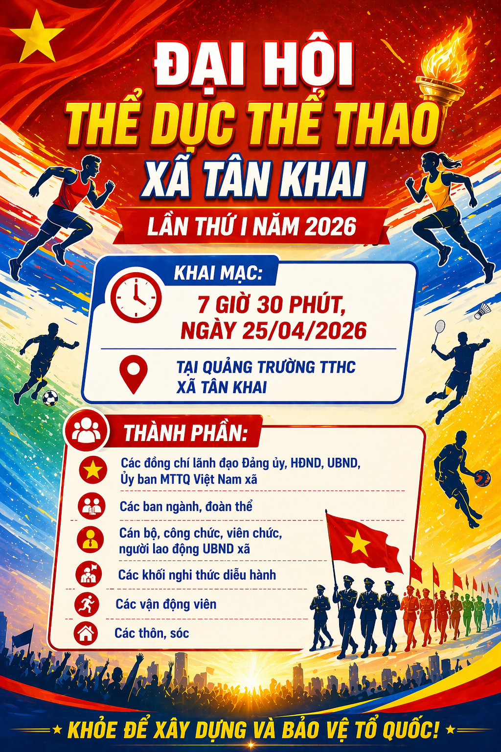 <p>ĐẠI HỘI THỂ DỤC THỂ THAO XÃ TÂN KHAI LẦN THỨ I NĂM 2026 SẼ KHAI MẠC VÀO LÚC 7 GIỜ, NGÀY 25/04/2026.&nbsp;</p><p>&nbsp;</p><p>Khai mạc: 7 giờ, ngày 25/04/2026.</p><p>Tại Quảng trường TTHC xã Tân Khai.&nbsp;</p><p>Thành phần: các đồng chí lãnh đạo Đảng ủy, HĐND, UBND, Ủy ban MTTQ Việt Nam xã; các ban ngành, đoàn thể;&nbsp;</p><p>Cán bộ, công chức, viên chức, người lao động UBND xã; các khối nghi thức diễu hành, vận động viên, các thôn, sóc.&nbsp;</p><p>&nbsp;</p><figure class="image image_resized" style="width:100%;"><img style="aspect-ratio:1024/1536;" src="https://tankhai.dongnai.gov.vn/uploads/tankhai/news/2026_04/info-thong-bao-khai-mac-dai-hoi-tdtt.png" width="1024" height="1536" /></figure>