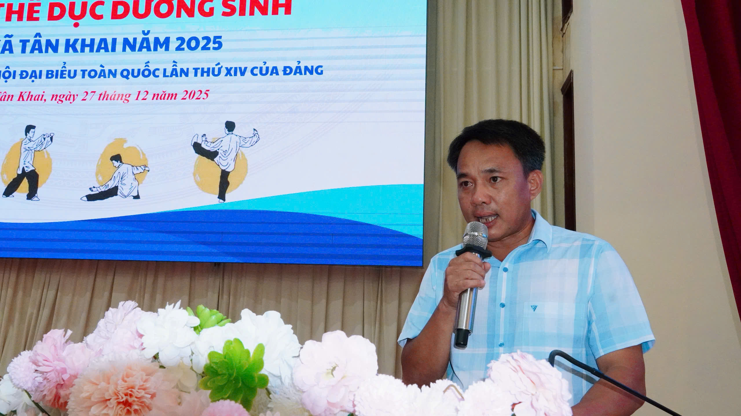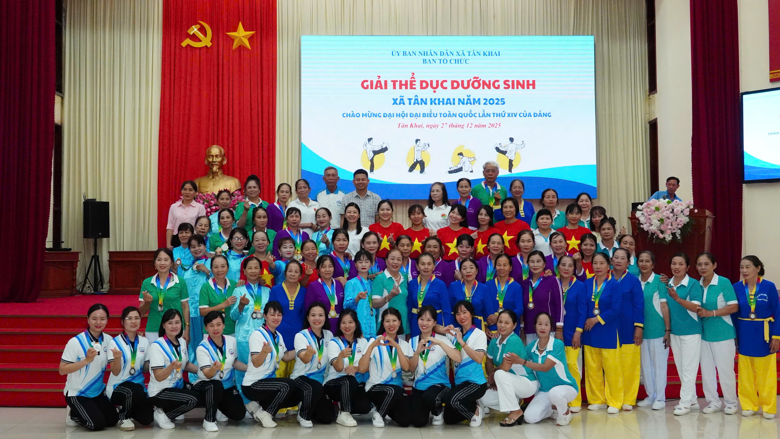 <div style="text-align: justify;"><span style="font-family:Arial,Helvetica,sans-serif;"><span style="font-size:14px;"><span style="line-height:107%"><span style="color:black"><span style="line-height:107%"><strong>Ngày 27/12, UBND xã Tân Khai đã tổ chức giải thể dục dưỡng sinh năm 2025. Dự và trao giải có ông Nguyễn Thanh Phong – Phó Trưởng phòng Văn hóa – Xã hội xã. Giải thu hút trên 100 vận động viên đến từ các thôn, sóc, trường học trên địa bàn xã tham gia.</strong></span></span></span><br />