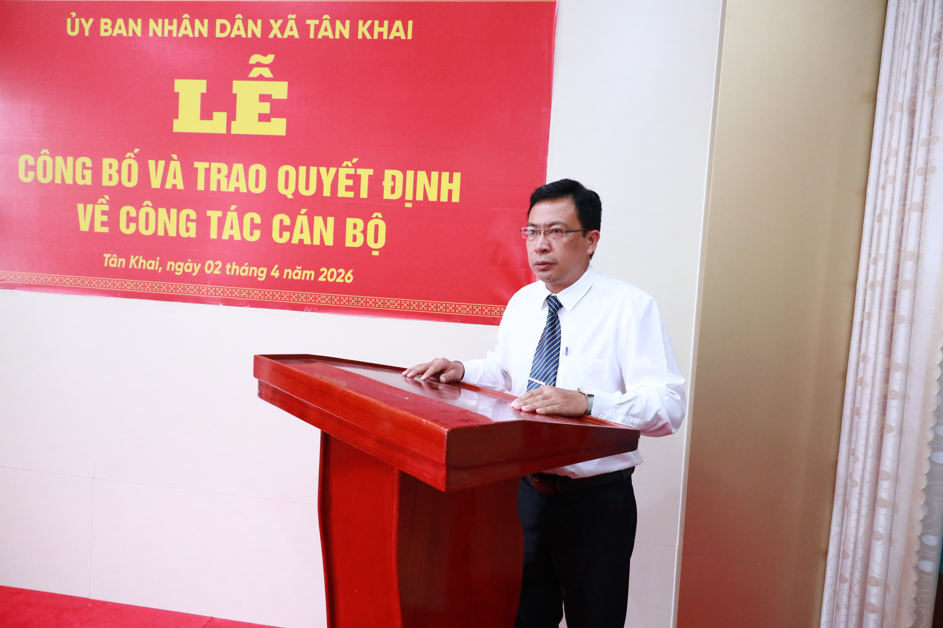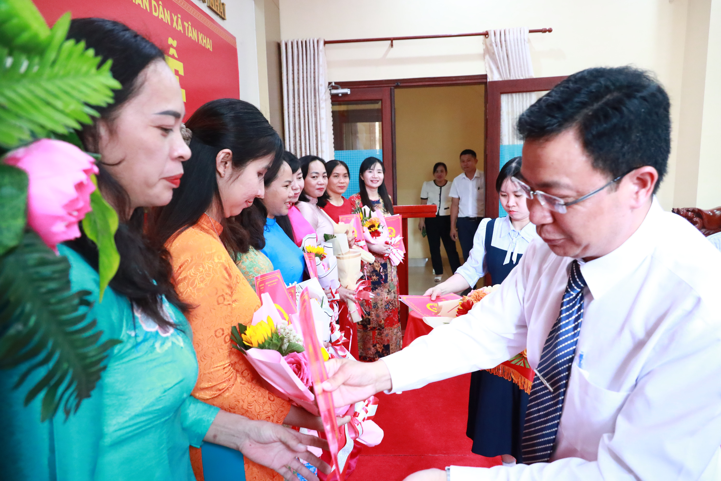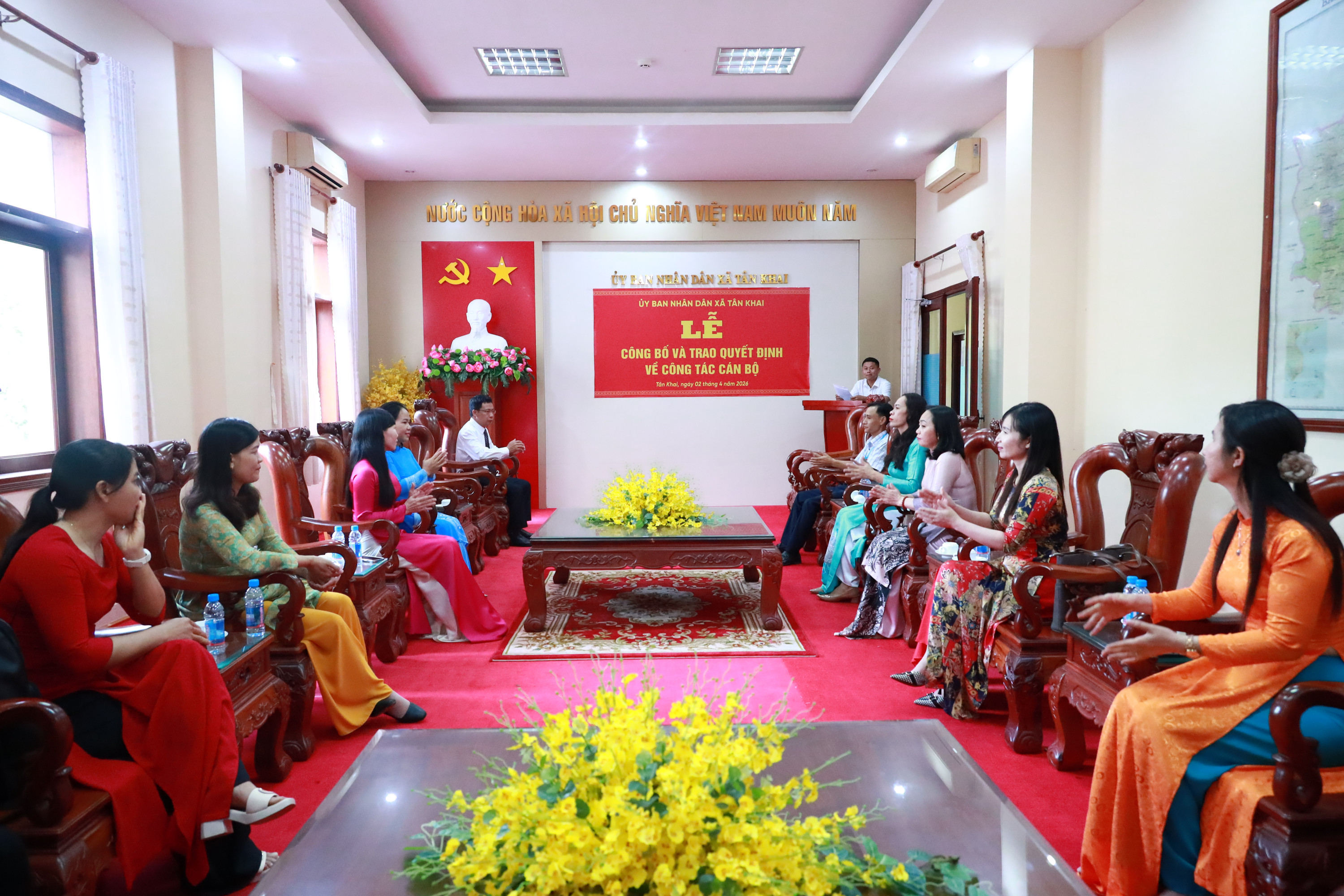 <span style="font-size:14px;">Chiều 2/4, UBND xã Tân Khai đã tổ chức lễ công bố và trao Quyết định bổ nhiệm lại chức vụ lãnh đạo, quản lý tại các đơn vị sự nghiệp Giáo dục – Đào tạo trên địa bàn xã. Dự trao quyết định và tặng hoa chúc mừng có Phó Chủ tịch UBND xã Nguyễn Viết Đợi, lãnh đạo Phòng Văn hóa – Xã hội và các cá nhân nhận quyết định.<br />