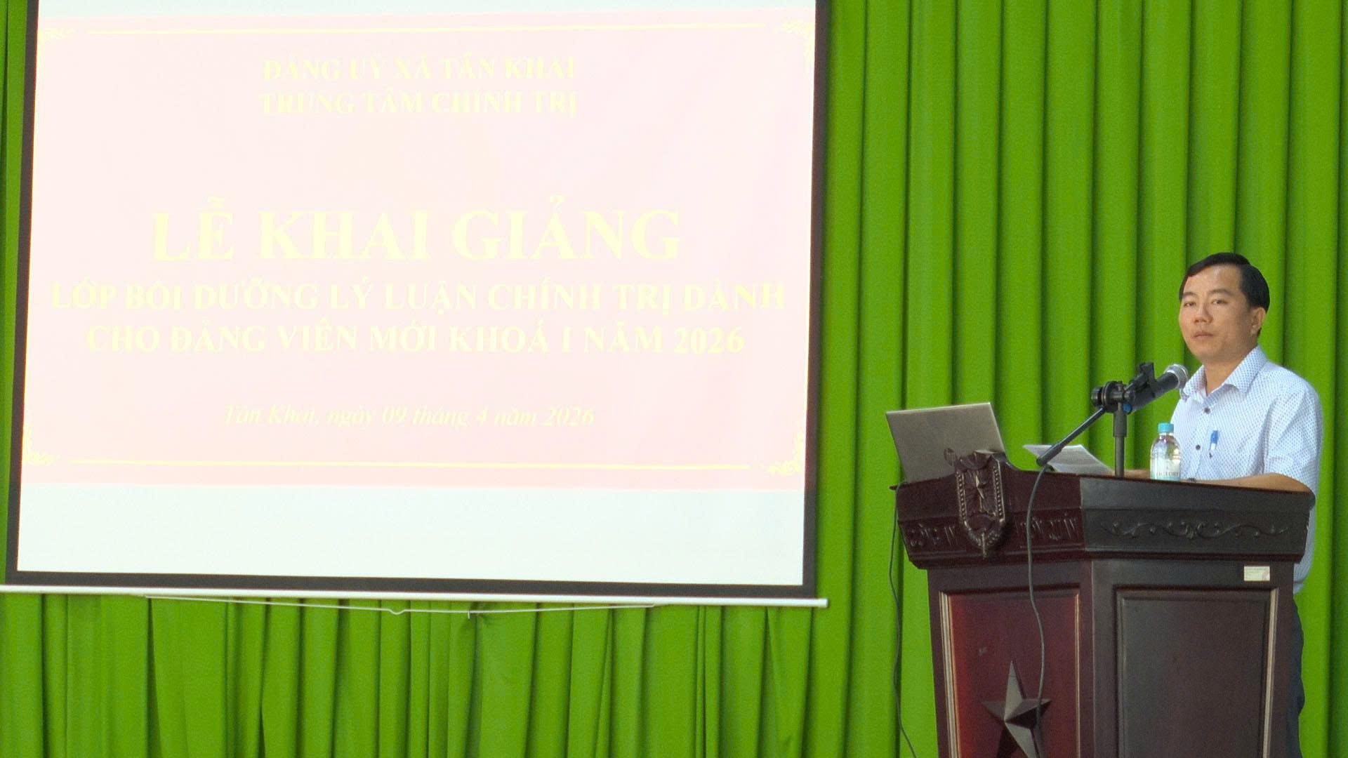Sáng ngày 09/04/2026, Trung tâm Chính trị xã Tân Khai đã tổ chức Lễ khai giảng lớp Bồi dưỡng lý luận chính trị dành cho đảng viên mới kết nạp, khóa I năm 2026. Tham dự buổi lễ có đồng chí Phan Văn Mạnh – Phó Bí thư Thường trực Đảng ủy xã, cùng 35 học viên là đảng viên mới kết nạp đến từ 4 xã: Tân Khai, Tân Quan, Tân Hưng và Minh Đức.<br />