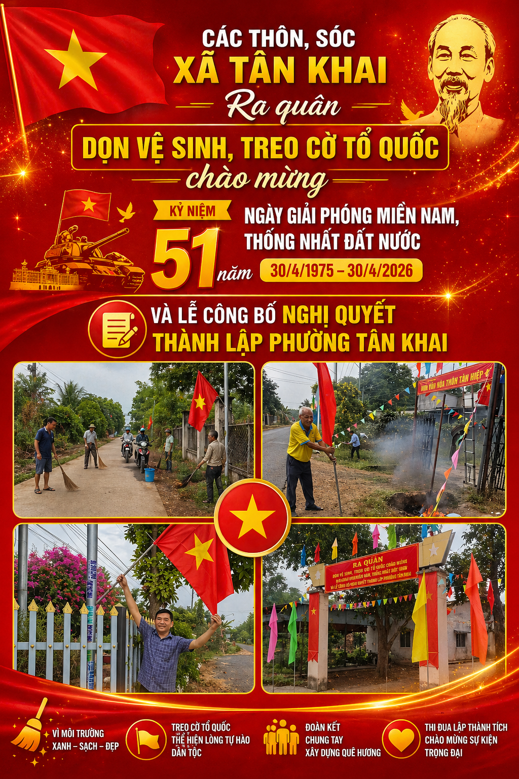 Các thôn, sóc xã Tân Khai ra quân dọn vệ sinh, treo cờ Tổ quốc chào mừng kỷ niệm 51 năm giải phóng miền Nam, thống nhất đất nước, 136 năm Ngày sinh Chủ tịch Hồ Chí Minh và Lễ công bố Nghị quyết thành lập phường Tân Khai.