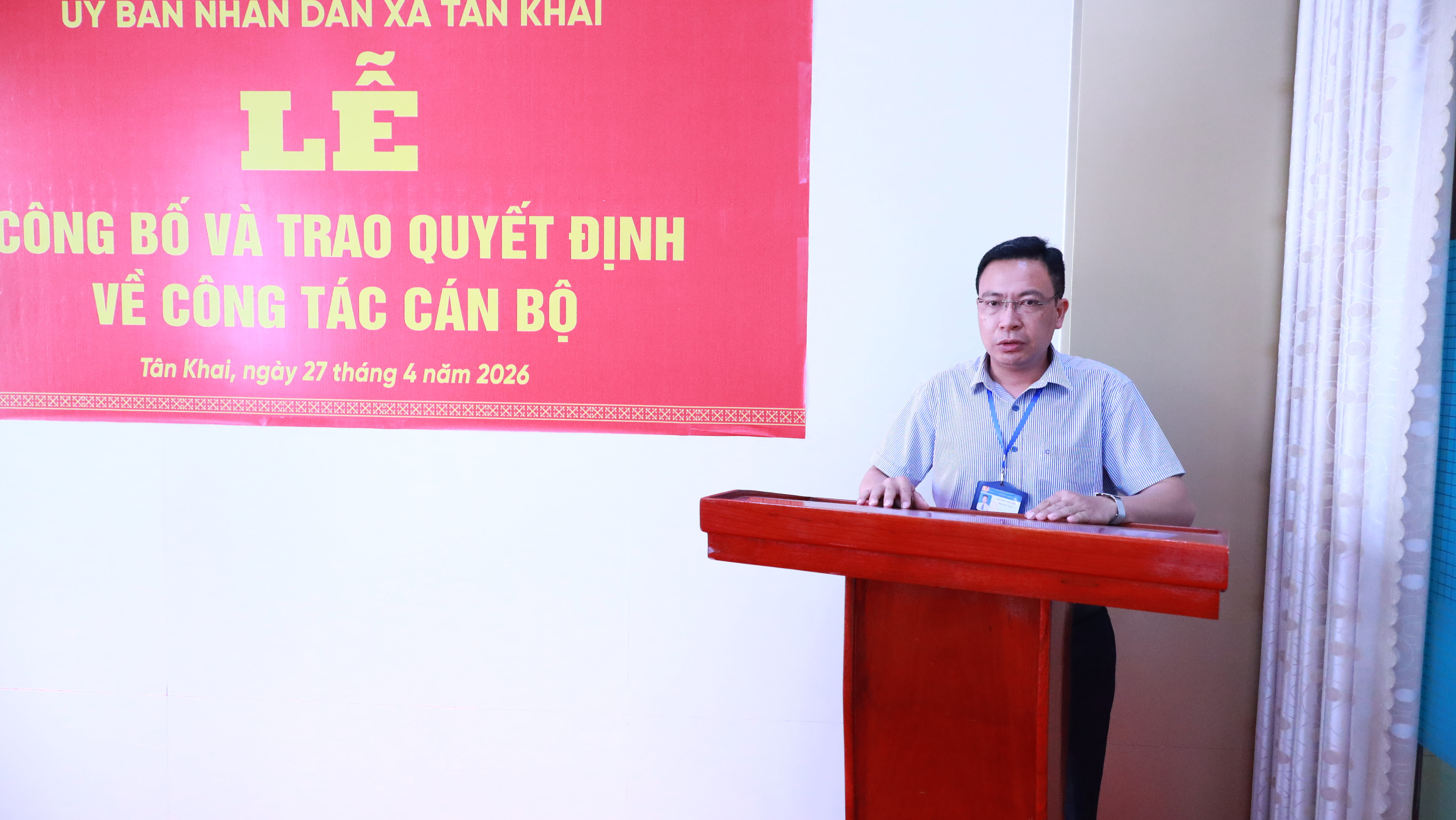 Tại buổi lễ, ông Đặng Bá Báu – Trưởng Phòng Văn hóa – Xã hội đã công bố các quyết định, gồm: giao phụ trách Trung tâm Phục vụ hành chính công đối với ông Dương Kim Đương – Phó Giám đốc Trung tâm Phục vụ hành chính công, phụ trách điều hành hoạt động của Trung tâm cho đến khi có chức danh Giám đốc; bổ nhiệm Phó Giám đốc và giao phụ trách Trạm Y tế xã Tân Khai đối với ông Phan Văn Tập, viên chức Trạm Y tế xã,, đồng thời phụ trách Trạm Y tế xã cho đến khi kiện toàn chức danh Giám đốc theo quy định.