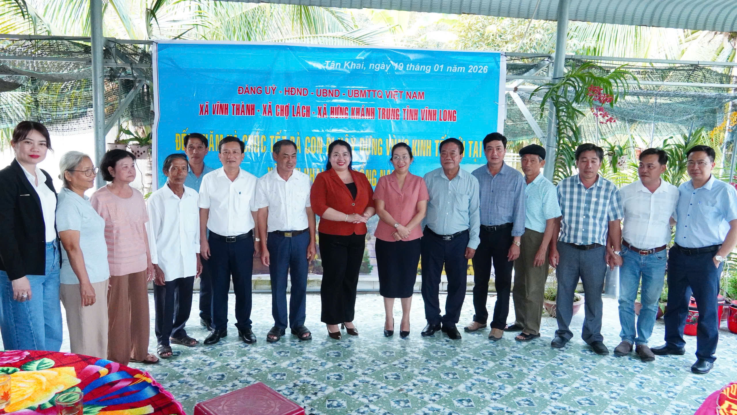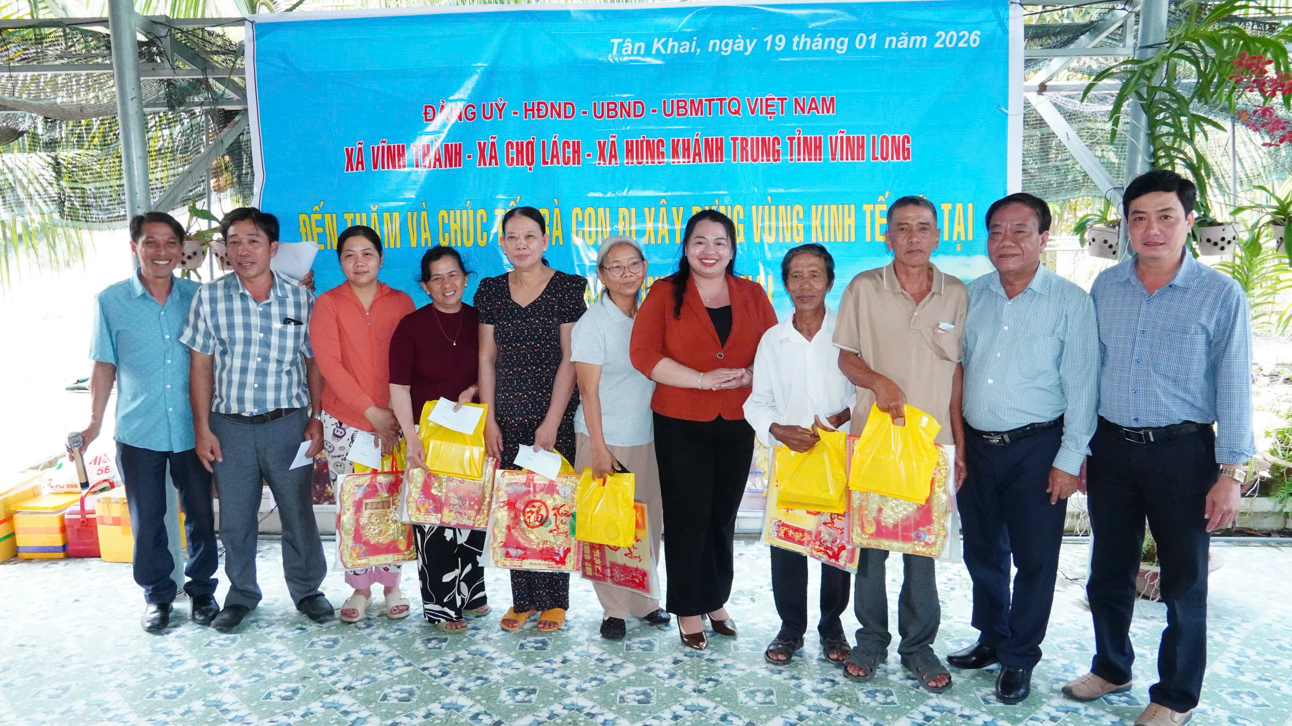 Cùng ngày, đoàn lãnh đạo các xã: Vĩnh Thành, Chợ Lách, Hưng Khánh Trung, tỉnh Vĩnh Long đã đến thăm, chúc tết và trao tặng các phần cho bà con đi xây dựng vùng kinh tế mới tại thôn Tân Lập, xã Tân Khai, tỉnh Đồng Nai. Qua đó, góp phần động viên bà con yên tâm lao động, sản xuất, xây dựng cuộc sống ngày một khởi sắc nơi vùng đất giàu tiềm năng phát triển Tân Khai.