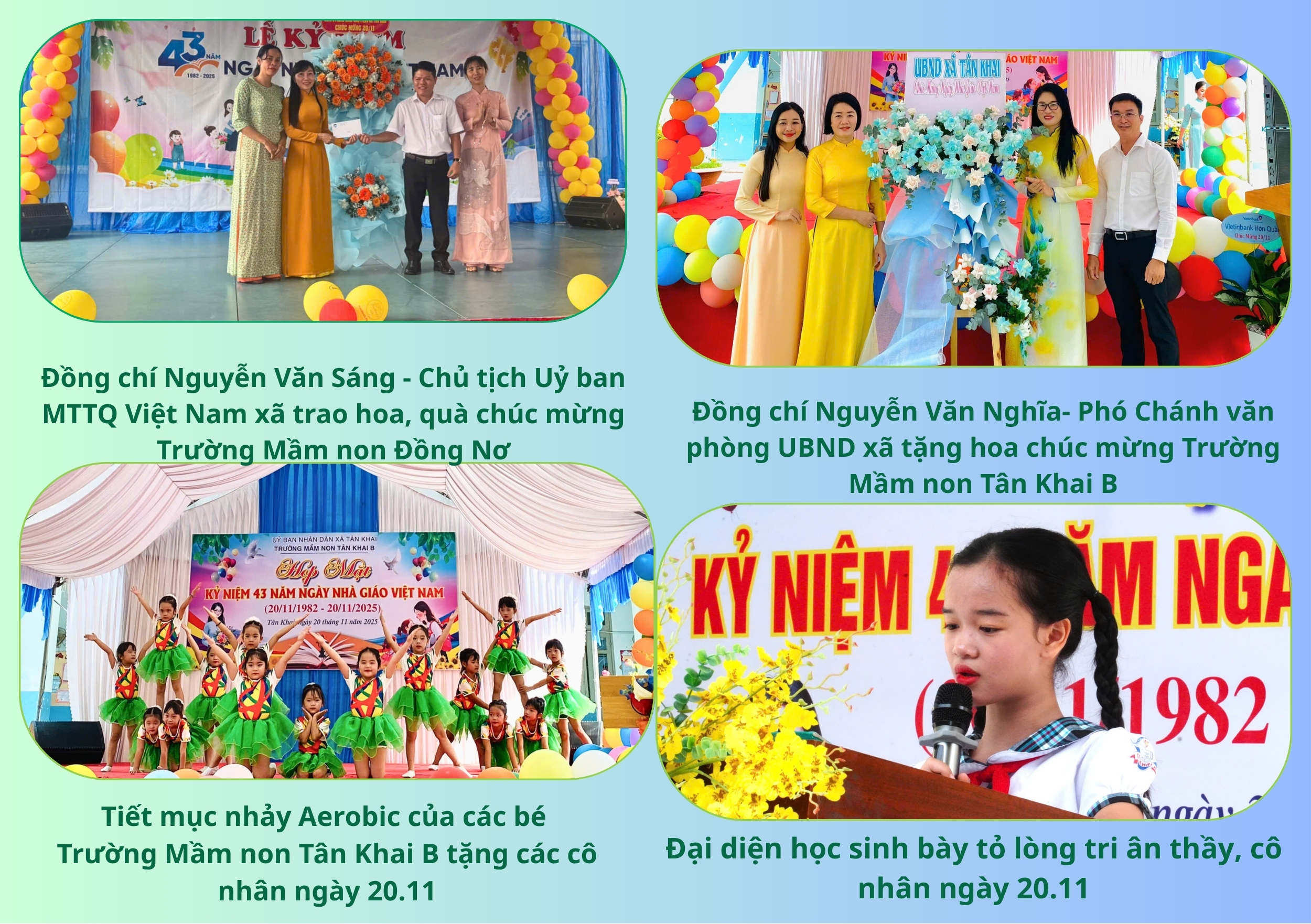 Tại các trường, các đại biểu và các thầy cô giáo đã cùng nhau ôn lại truyền thống 43 năm ngày nhà giáo Việt Nam (20/11/1982-20/11/2025). Kế thừa truyền thống đó, trong suốt các năm học qua, những người “đưa đò thầm lặng” đã miệt mài không ngơi nghĩ trên hành trình chèo lái “con thuyền tri thức”, đưa các em đến “bến bờ vinh quang”. Đã có biết bao thế hệ học trò đến, trưởng thành rồi tung cánh vươn ra biển lớn trên cái nôi đào tạo tận tụy của các thầy, cô giáo.