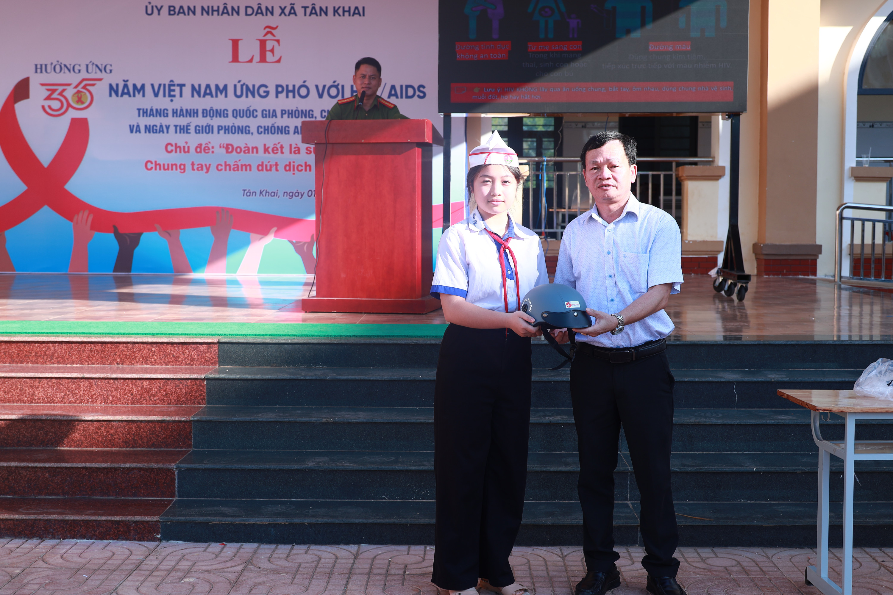 Cùng với đó, đại diện công an xã Tân Khai đã tuyên truyền về thông điệp “hiểu đúng – phòng tốt – không kỳ thị” nhằm cung cấp kiến thức cho các em học sinh, đoàn viên thanh niên trong phòng ngừa lây nhiễm HIV và cách ứng xử với người nhiễm HIV.