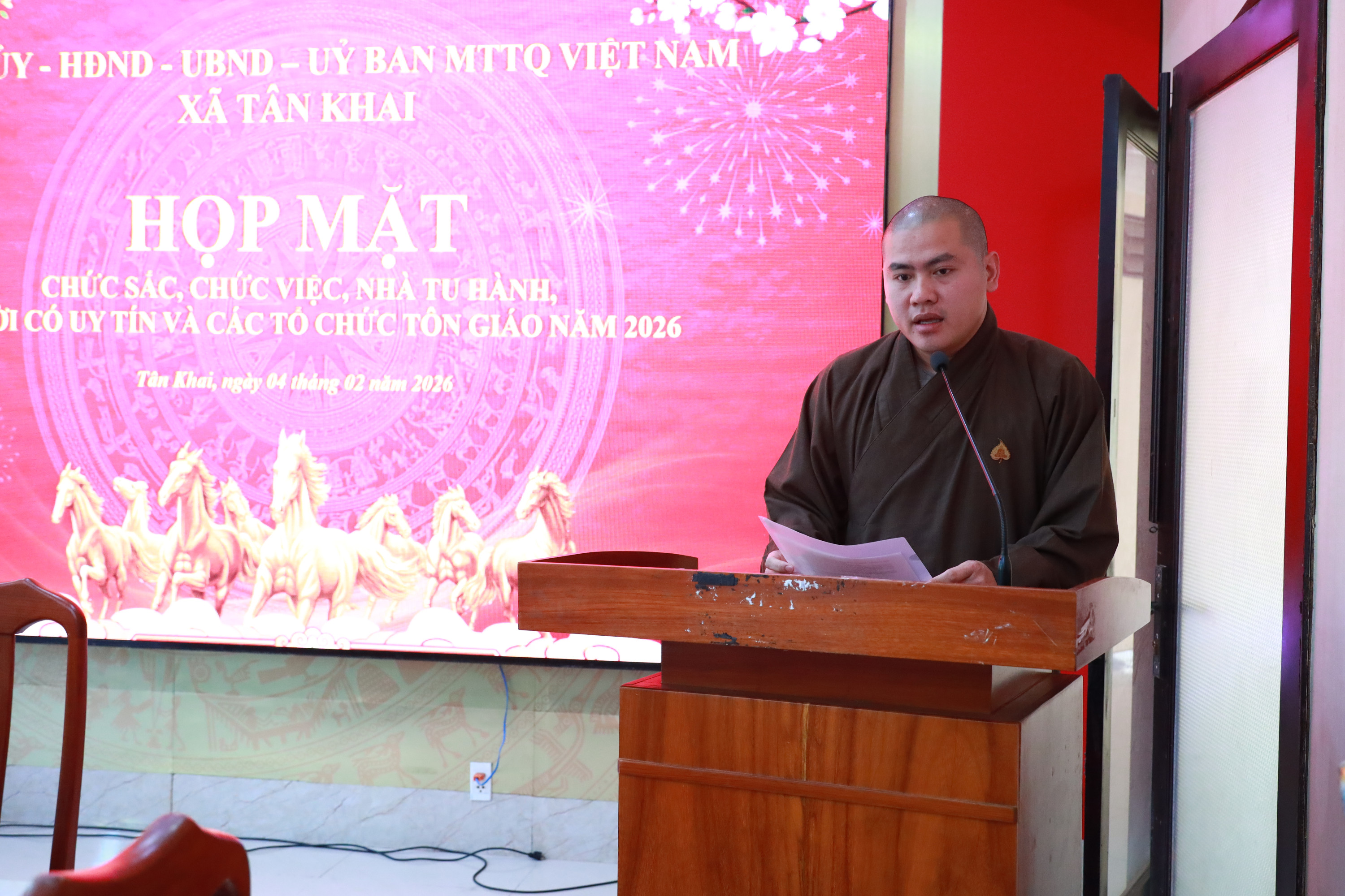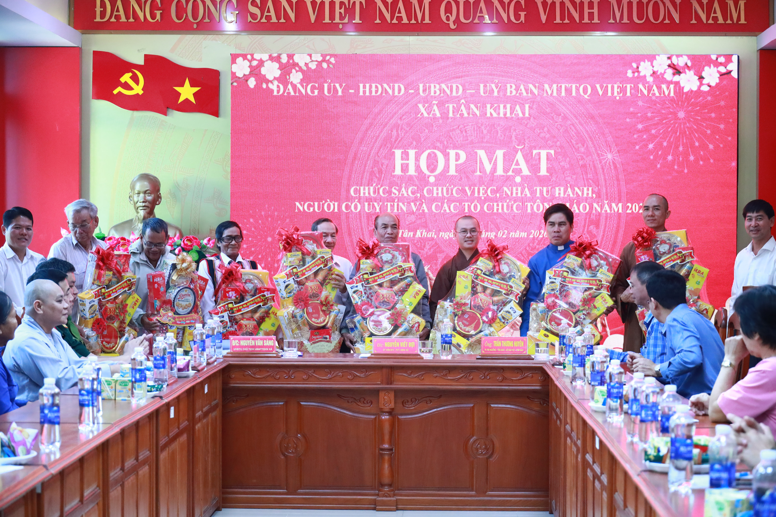 Phát biểu tại buổi họp mặt, ông Trần Thương Huyền ghi nhận và đánh giá cao những đóng góp của các tổ chức tôn giáo trong công tác nhân đạo, từ thiện, giữ gìn an ninh trật tự, góp phần củng cố khối đại đoàn kết toàn dân tộc; đồng thời mong muốn các tôn giáo tiếp tục đồng hành cùng địa phương xây dựng xã Tân Khai ngày càng phát triển.