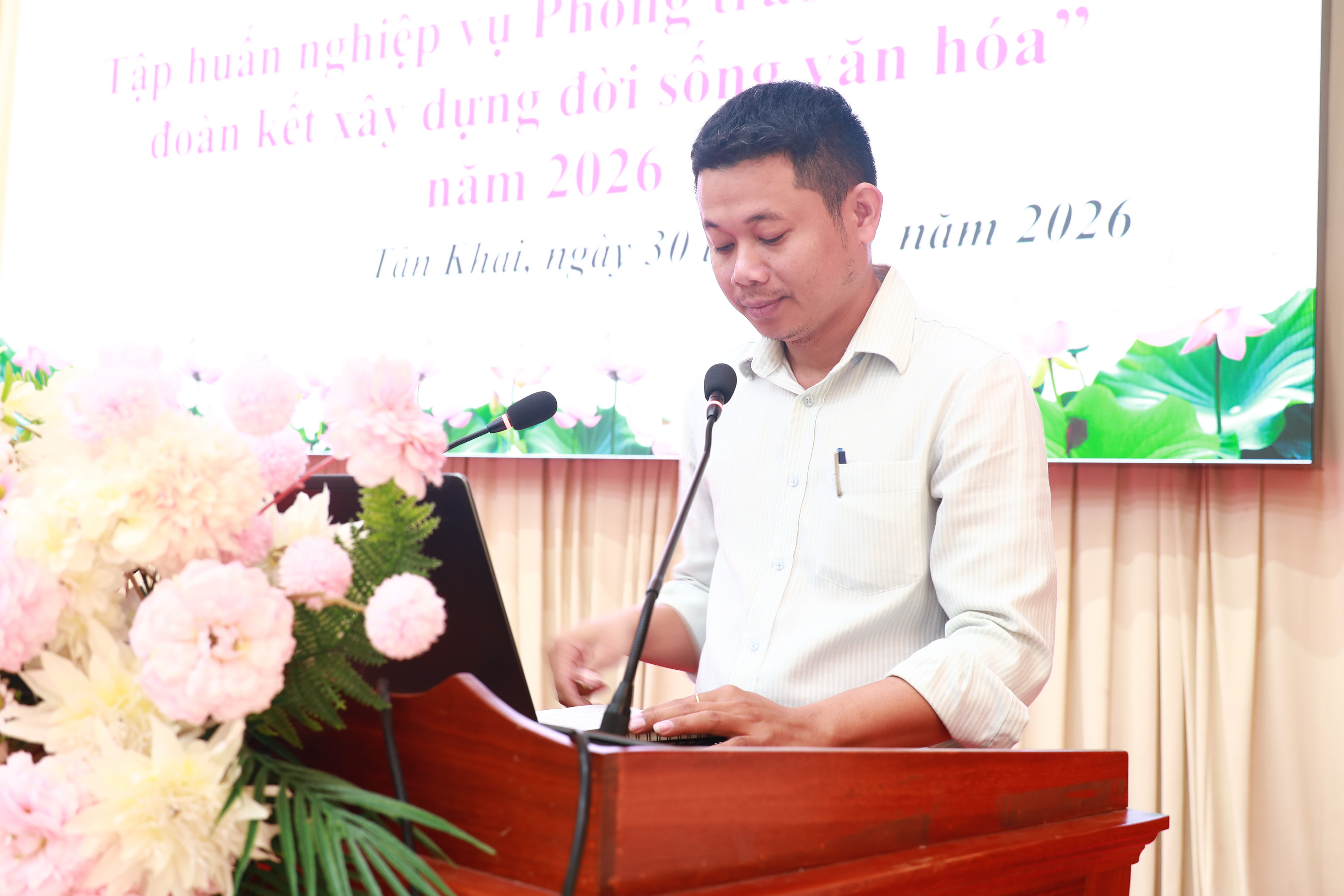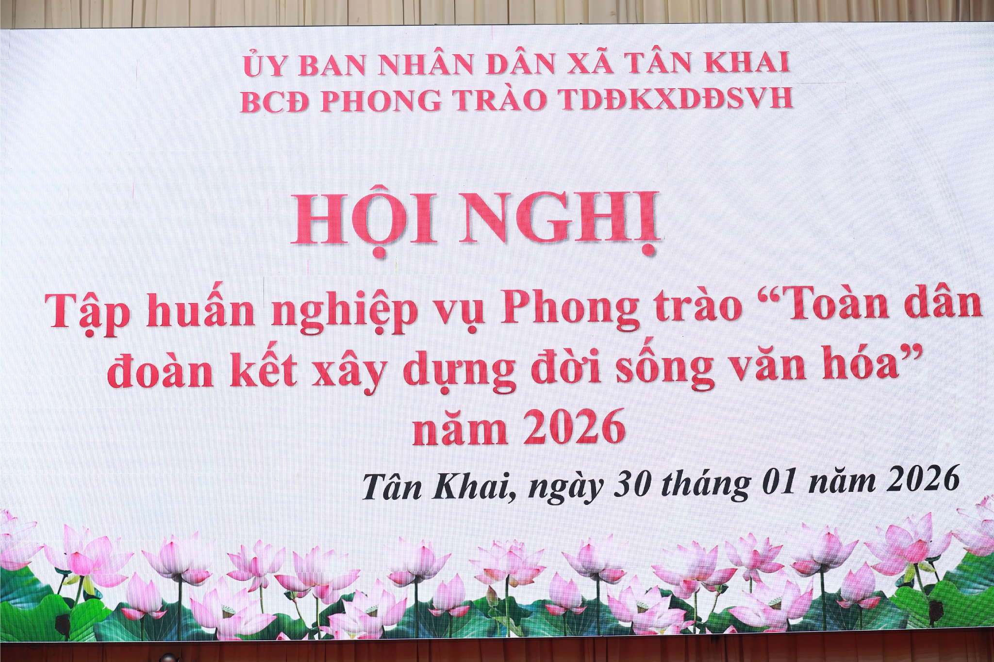Ngày 30/01, tại hội trường UBND xã, Ban Chỉ đạo Phong trào “Toàn dân đoàn kết xây dựng đời sống văn hóa” xã Tân Khai đã tổ chức tập huấn nghiệp vụ Phong trào “Toàn dân đoàn kết xây dựng đời sống văn hóa” năm 2026.