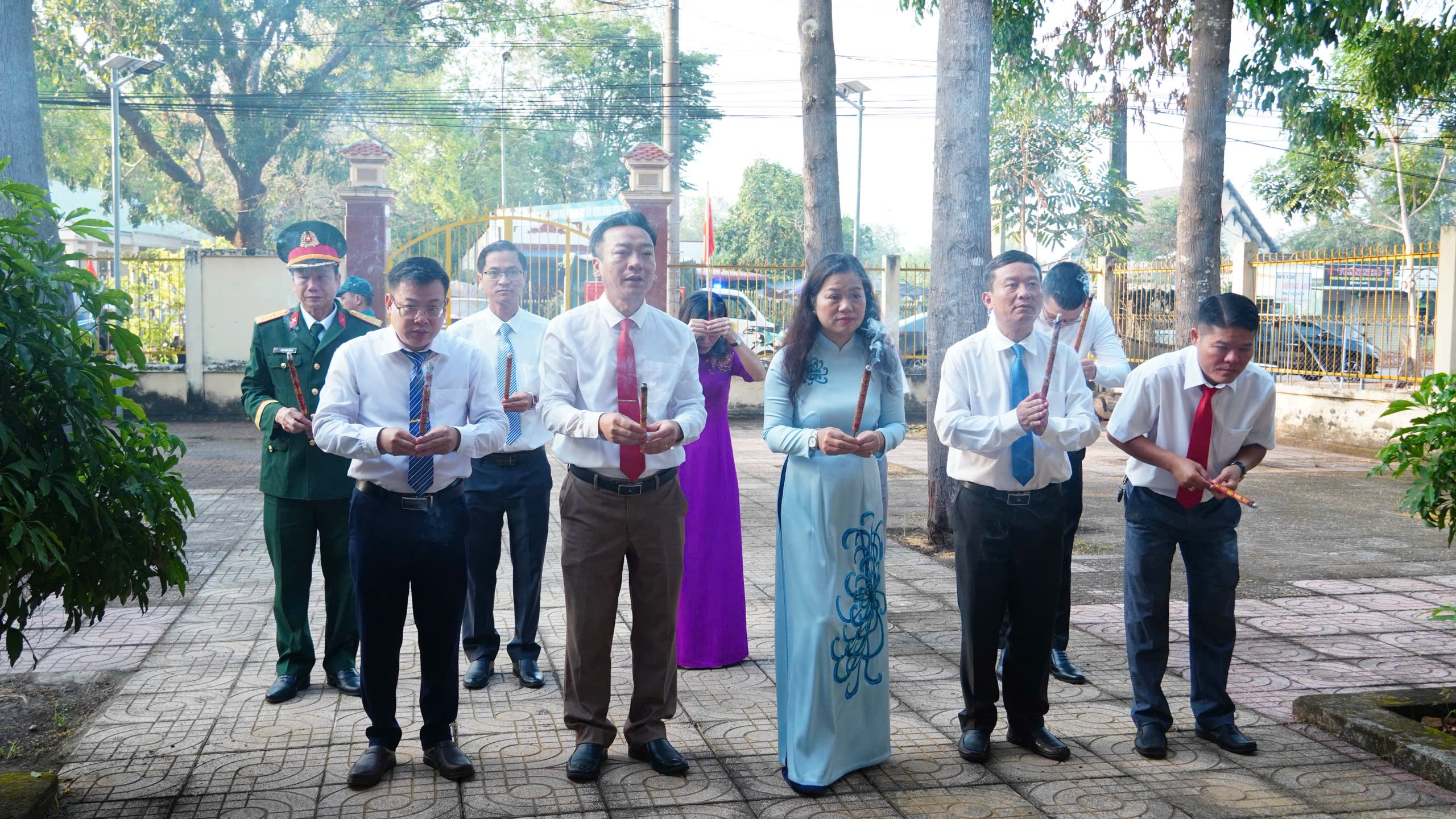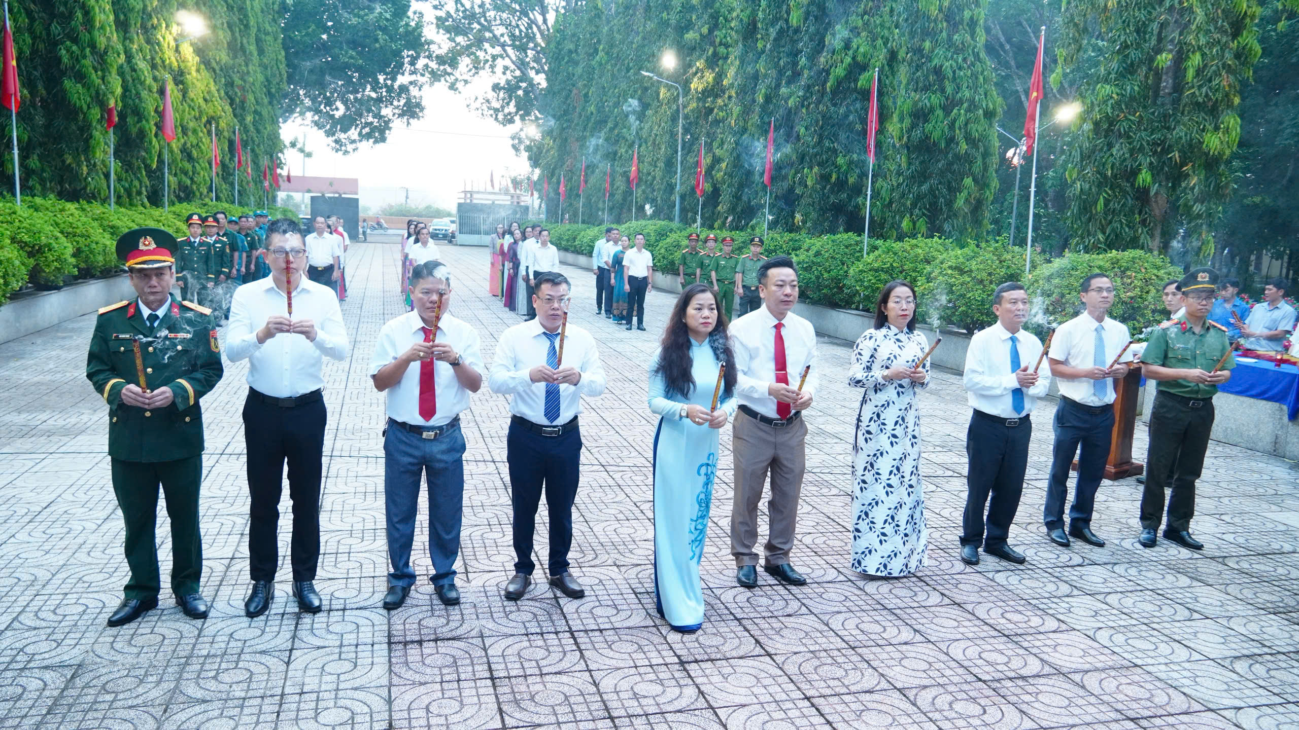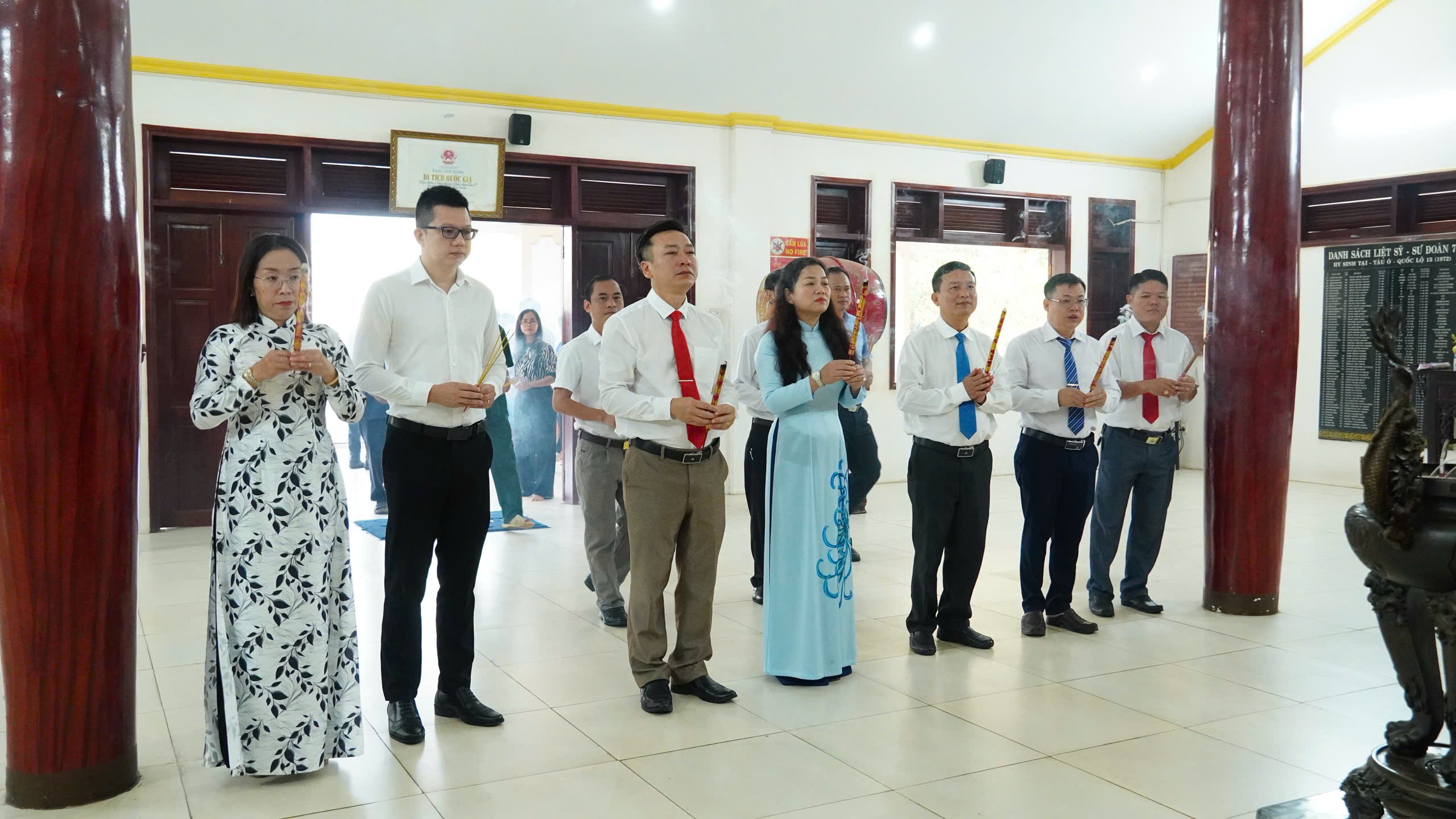 Ngay sau đó, đoàn đã tiếp tục đến dâng hương tại Di tích địa điểm Chiến thắng chốt chặn Tàu Ô – biểu tượng oai hùng của quân và dân Tân Khai trong cuộc kháng chiến chống Mỹ cứu nước. Cùng ngày, lễ dâng hương tại nhà Bia tưởng niệm liệt sĩ xã Tân Khai cũng được tổ chức trang trọng, đầy xúc động.