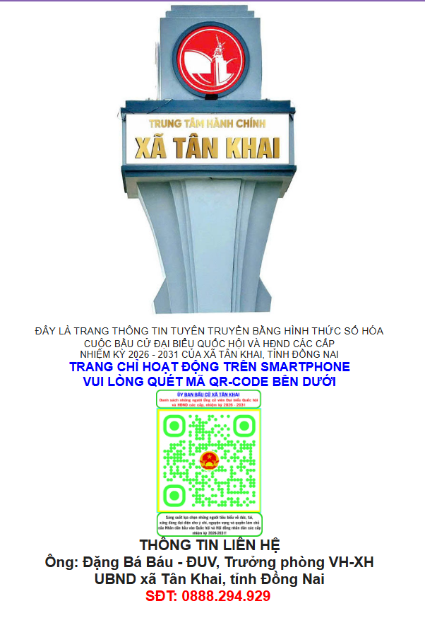 Xin trân trọng giới thiệu Trang điện tử phục vụ việc tra cứu và tìm hiểu thông tin về công tác bầu cử đại biểu Quốc hội khóa XVI và bầu cử đại biểu HĐND các cấp nhiệm kỳ 2026 - 2031 trên địa bàn xã Tân Khai, tỉnh Đồng Nai. Click vào đây