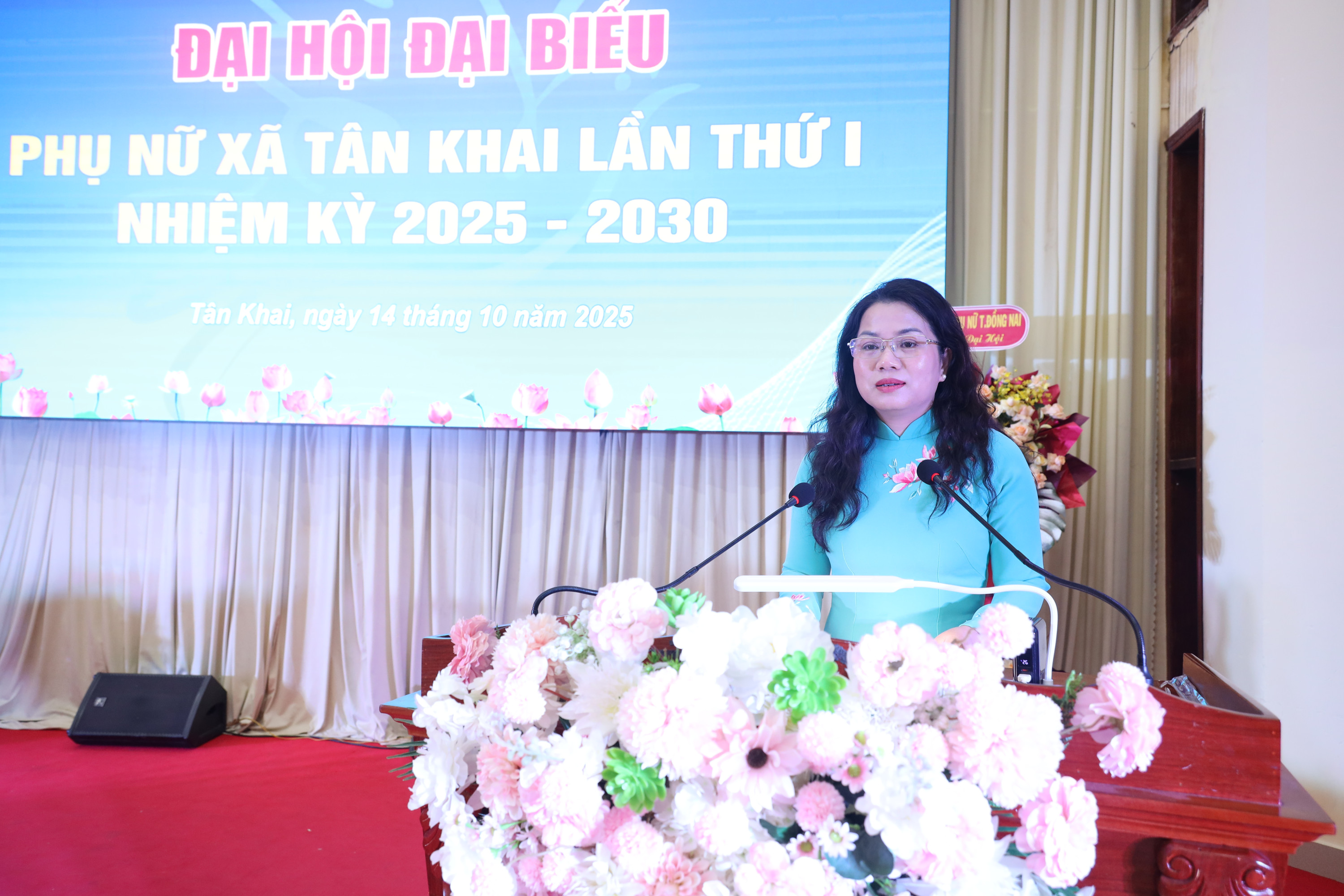 Phát biểu chỉ đạo tại Đại hội, đồng chí Quách Thị Ánh, Tỉnh ủy viên, Bí thư Đảng ủy - Chủ tịch Hội đồng nhân dân xã đã gợi mở, định hướng một số vấn đề nổi bật như: hội cần tiếp tục đổi mới nội dung, phương thức hoạt động Hội theo mô hình mới hiệu quả hơn; nâng cao chất lượng đội ngũ cán bộ và hội viên thông qua việc đẩy mạnh học tập và làm theo tư tưởng, đạo đức, phong cách Hồ Chí Minh gắn với phong trào thi đua “Xây dựng người phụ nữ Việt Nam thời đại mới”; nâng cao năng lực chuyển đổi số; đẩy mạnh các hoạt động hỗ trợ phụ nữ phát triển toàn diện, giảm nghèo bền vững, khởi nghiệp. Nhân rộng các mô hình kinh tế hiệu quả. Vận động phụ nữ tích cực tham gia xây dựng nông thôn mới, đô thị văn minh, bảo vệ môi trường. Với tinh thần: “Đoàn kết – Dân chủ - Đổi mới – Phát triển”, Đại hội đại biểu phụ nữ xã Tân Khai lần thứ I đã thành công tốt đẹp. Đại hội đã thông qua Nghị quyết nhiệm kỳ 2025 – 2030: nổi bật, đăng ký thực hiện ít nhất 01 công trình phần việc góp phần xây dựng nông thôn mới và đô thị văn minh; 100% cán bộ Hội đăng ký học tập ít nhất 01 khóa học, chương trình đào tạo, tập huấn nâng cao năng lực số.