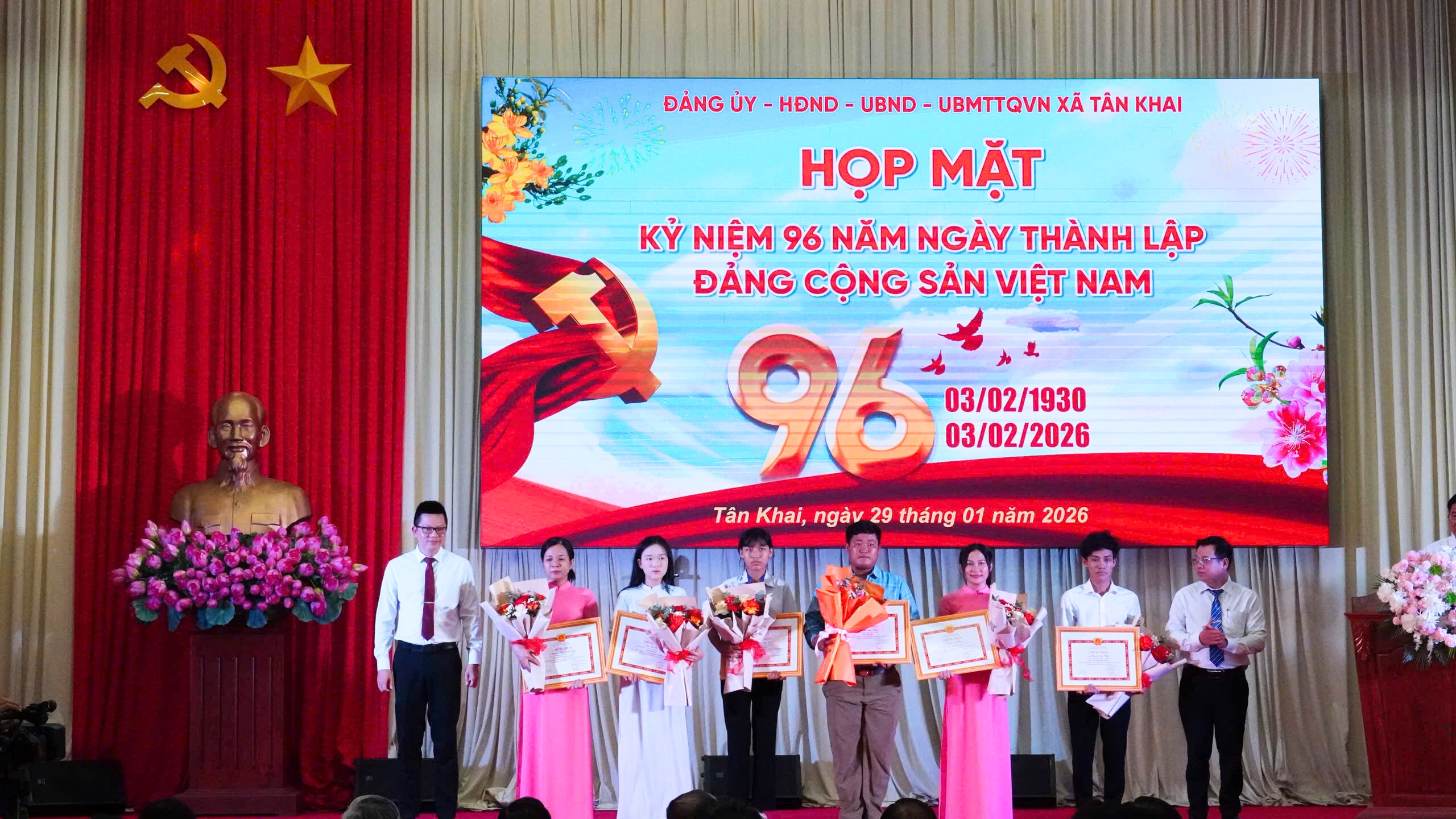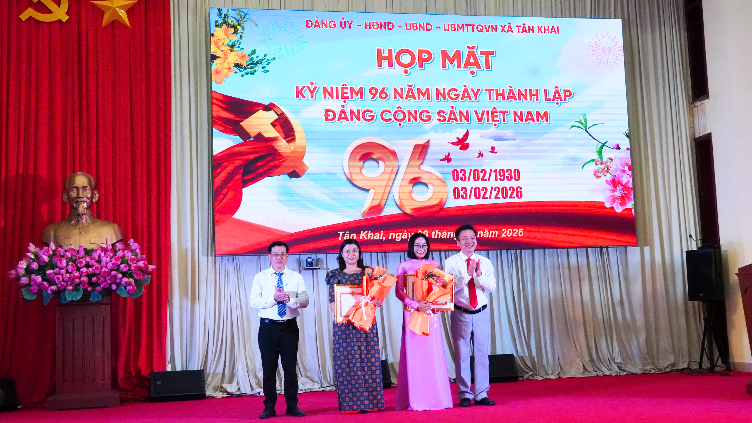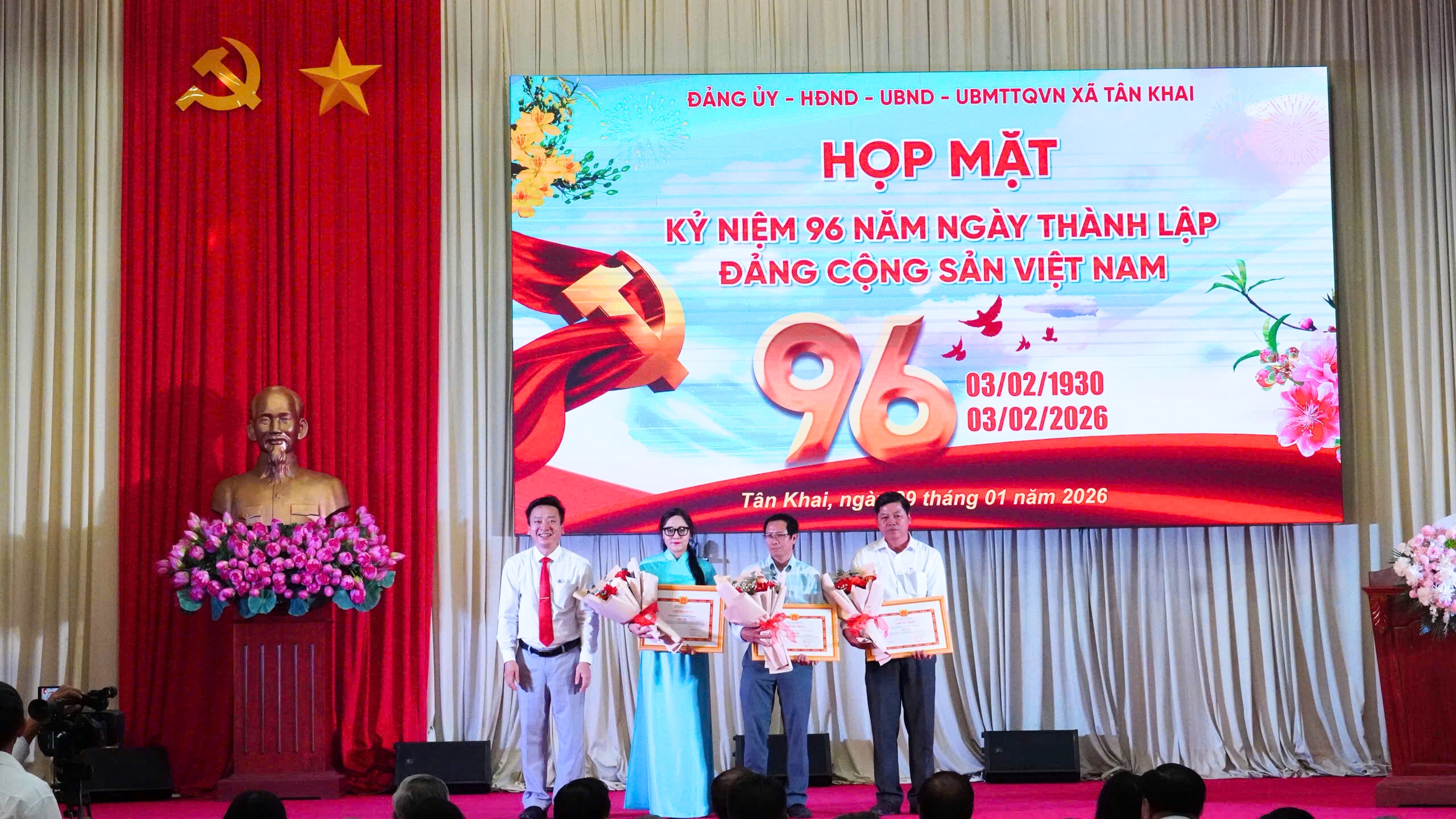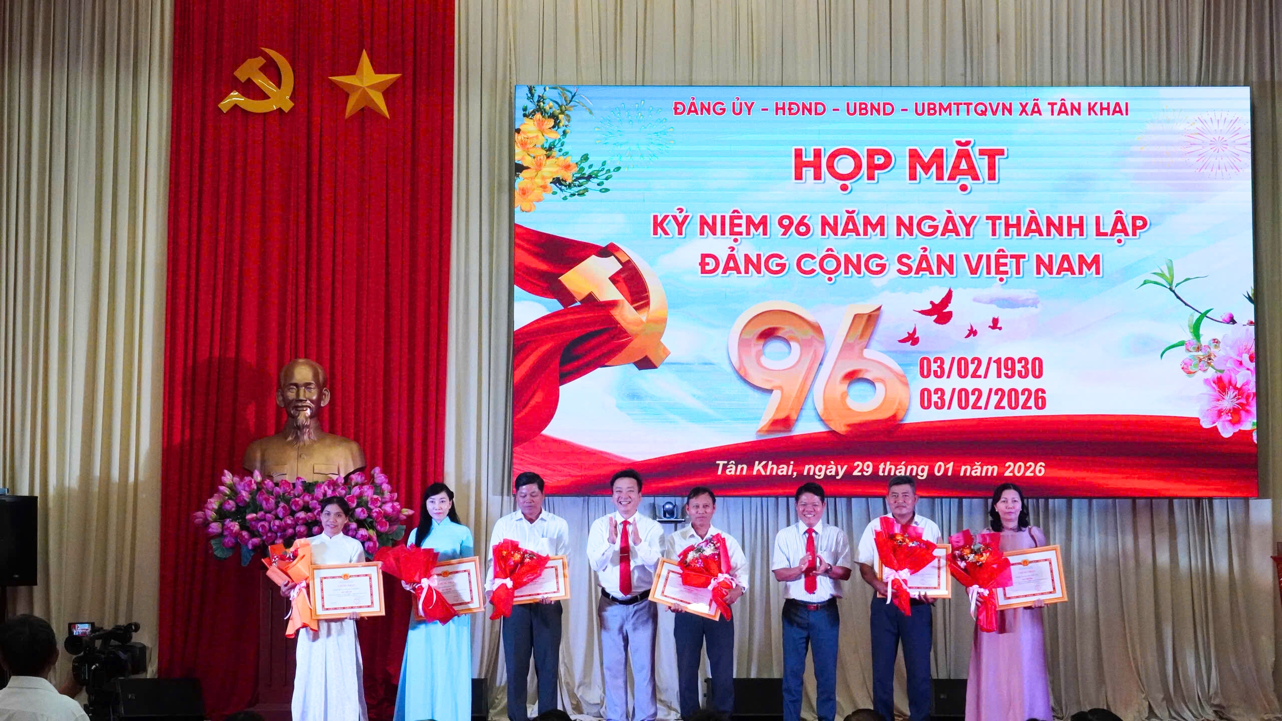 Hòa trong không khí phấn khởi mừng Đảng quang vinh, mừng Xuân Bính Ngọ, chào mừng thành công Đại hội Đảng toàn quốc lần thứ XIV của Đảng Cộng sản Việt Nam, chiều 29/01/2026, Đảng ủy xã Tân Khai tổ chức họp mặt kỷ niệm 96 năm Ngày thành lập Đảng Cộng sản Việt Nam (03/02/1930 – 03/02/2026); khen thưởng các tổ chức đảng, đảng viên hoàn thành xuất sắc nhiệm vụ năm 2025 và giai đoạn 2021 – 2025.